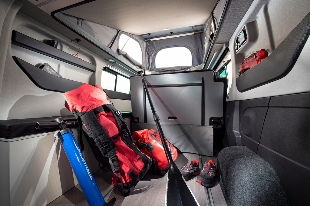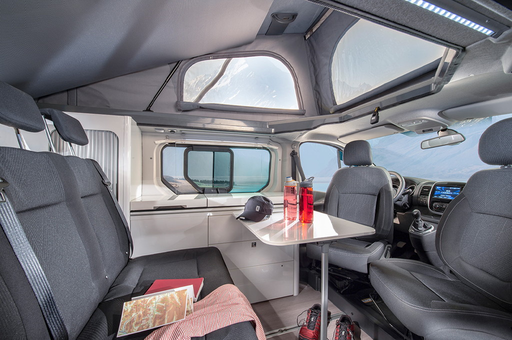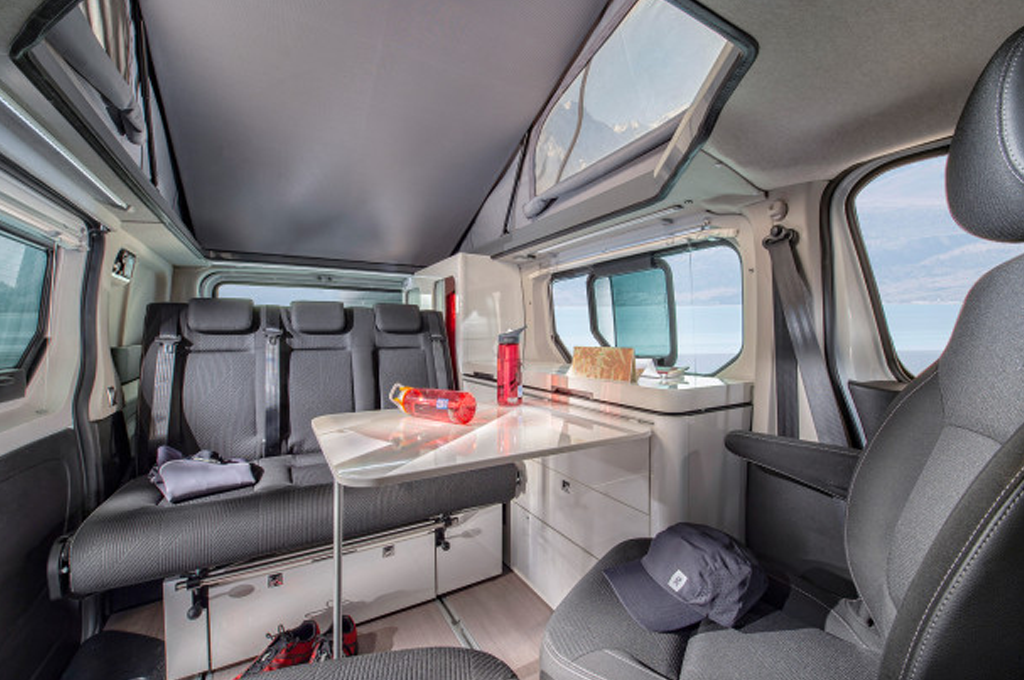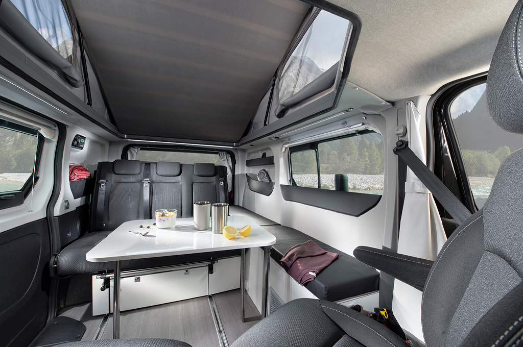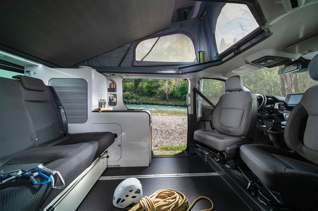 Gli spazi living sono flessibili e ben organizzati, con opzioni di sistemazione che includono un comodo letto basculante pop-top e un letto pieghevole nel soggiorno. Il tetto a soffietto offre ulteriori posti letto, rendendo il minivan adatto anche per famiglie. La dinette è equipaggiata con sedili girevoli e una panca ribaltabile, permettendo di ospitare fino a cinque persone (sei come optional), con disponibilità di attacchi ISOFIX per i seggiolini dei bambini.