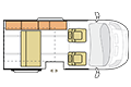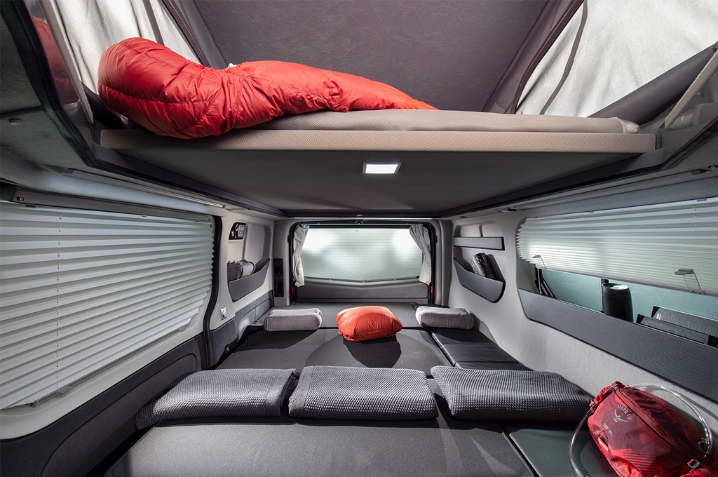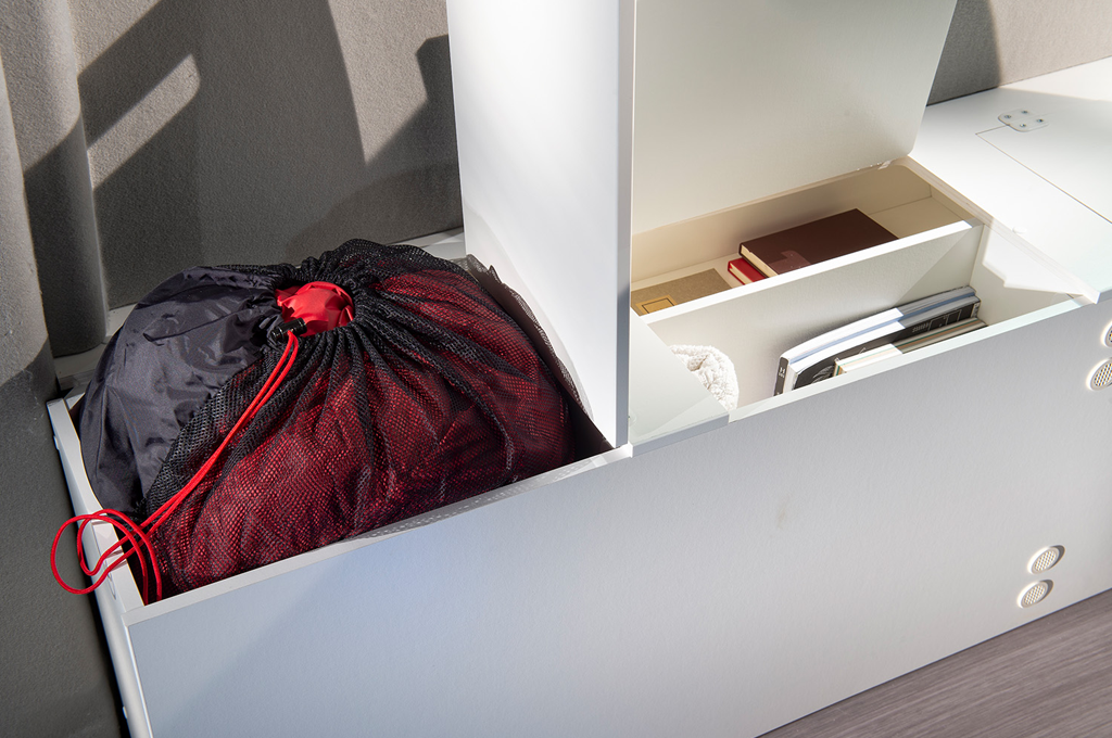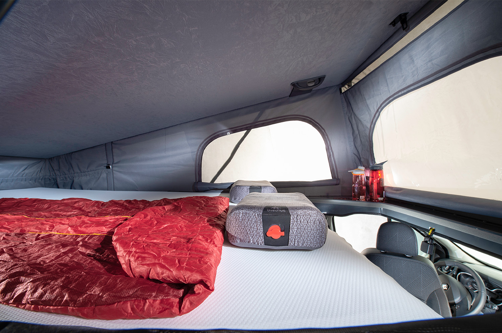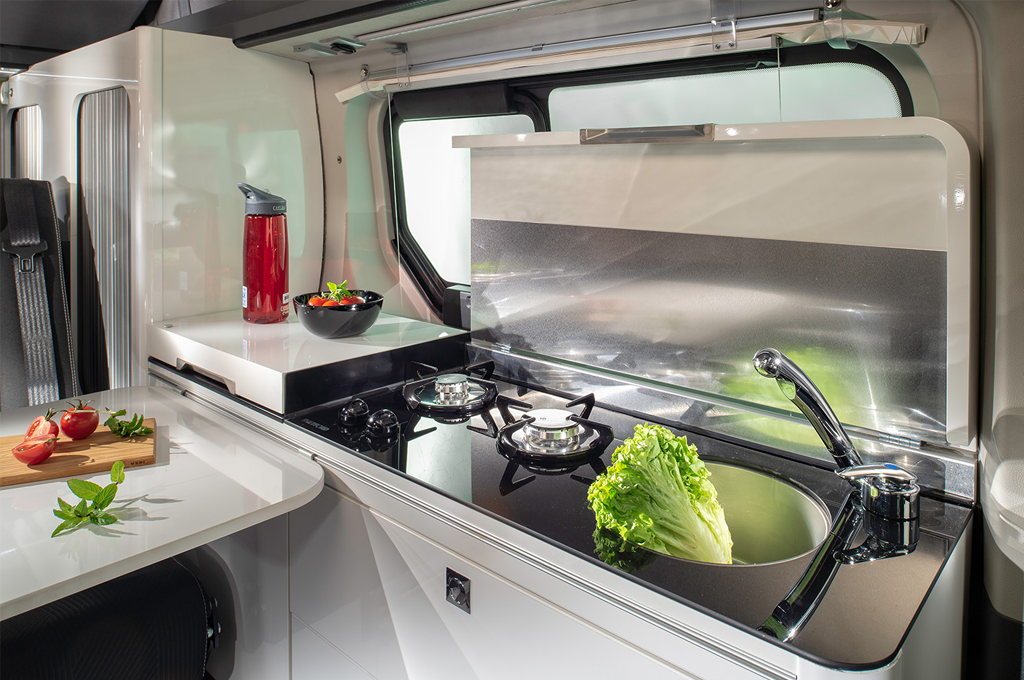 Gli spazi living sono flessibili e ben organizzati, con opzioni di sistemazione che includono un comodo letto basculante pop-top e un letto pieghevole nel soggiorno. Il tetto a soffietto offre ulteriori posti letto, rendendo il minivan adatto anche per famiglie. La dinette è equipaggiata con sedili girevoli e una panca ribaltabile, permettendo di ospitare fino a cinque persone (sei come optional), con disponibilità di attacchi ISOFIX per i seggiolini dei bambini.