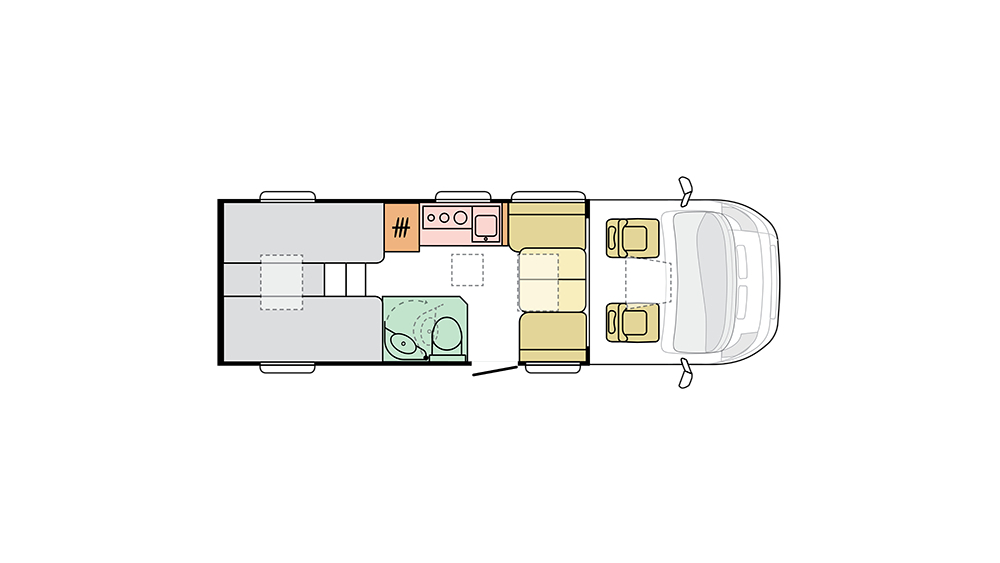 Gli interni spaziosi e confortevoli creano un'atmosfera accogliente e moderna, con una zona living versatile e ampiamente configurabile. La dinette offre comode sedute ergonomiche, mentre una parete divisoria integra la cucina, ottimizzando lo spazio senza sacrificare la funzionalità. La regolazione ottimizzata della temperatura tramite il riscaldamento Truma assicura comfort indipendentemente dalle condizioni climatiche esterne.