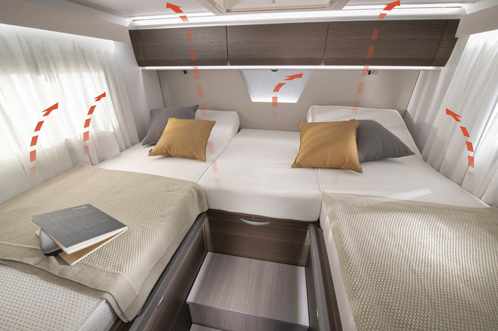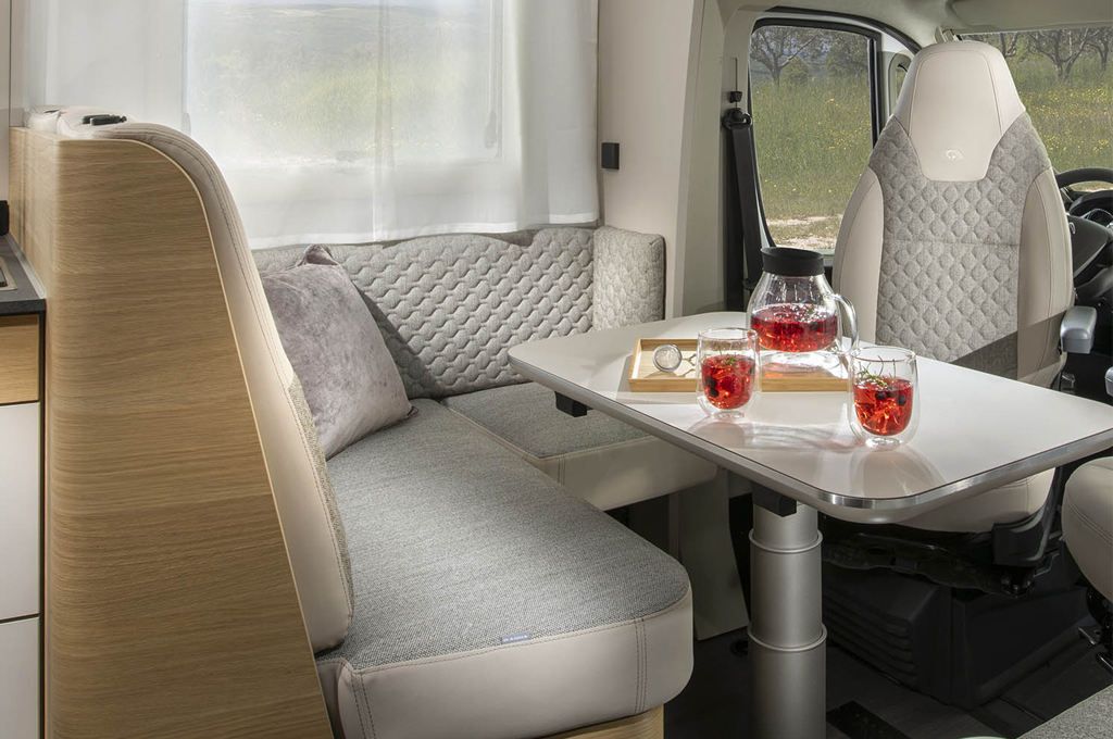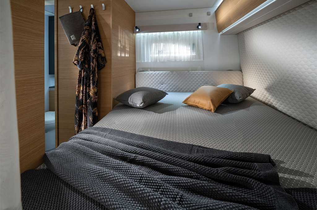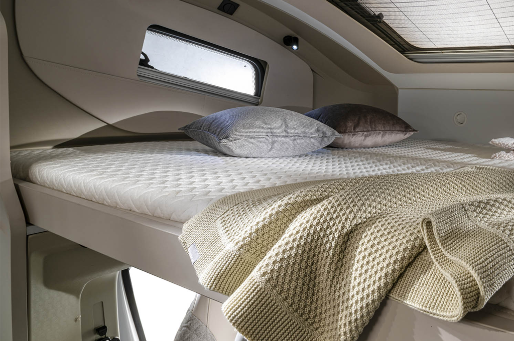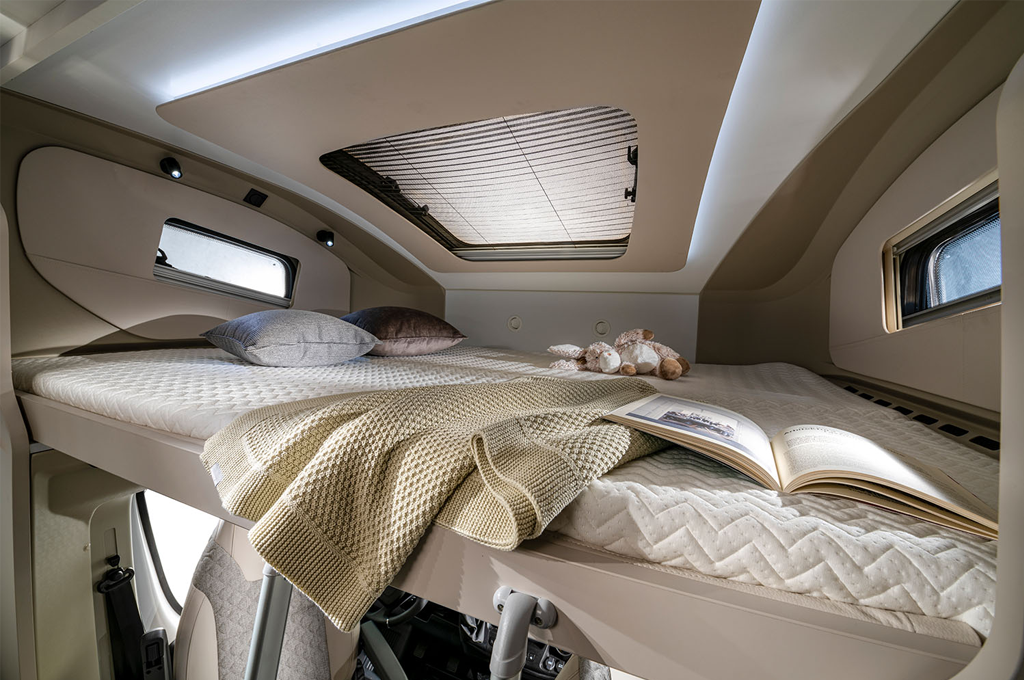 Il salone è il cuore pulsante di questi veicoli, offrendo spazio più che sufficiente per ospitare fino a sette persone in sedute comode e dotate di sistema Isofix. La grande finestra panoramica permette di godere appieno del paesaggio circostante, mentre il letto fisso in mansarda assicura un riposo rigenerante dopo una giornata piena di avventure.