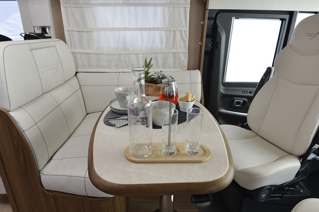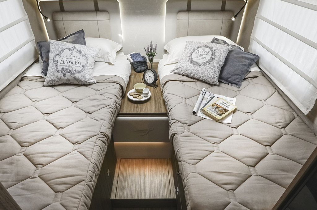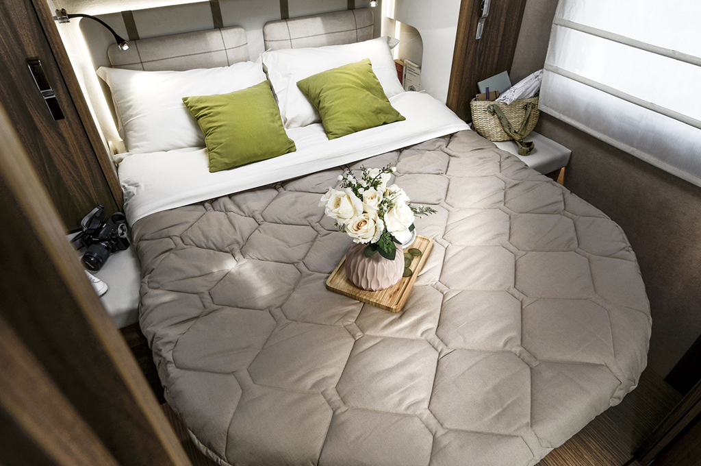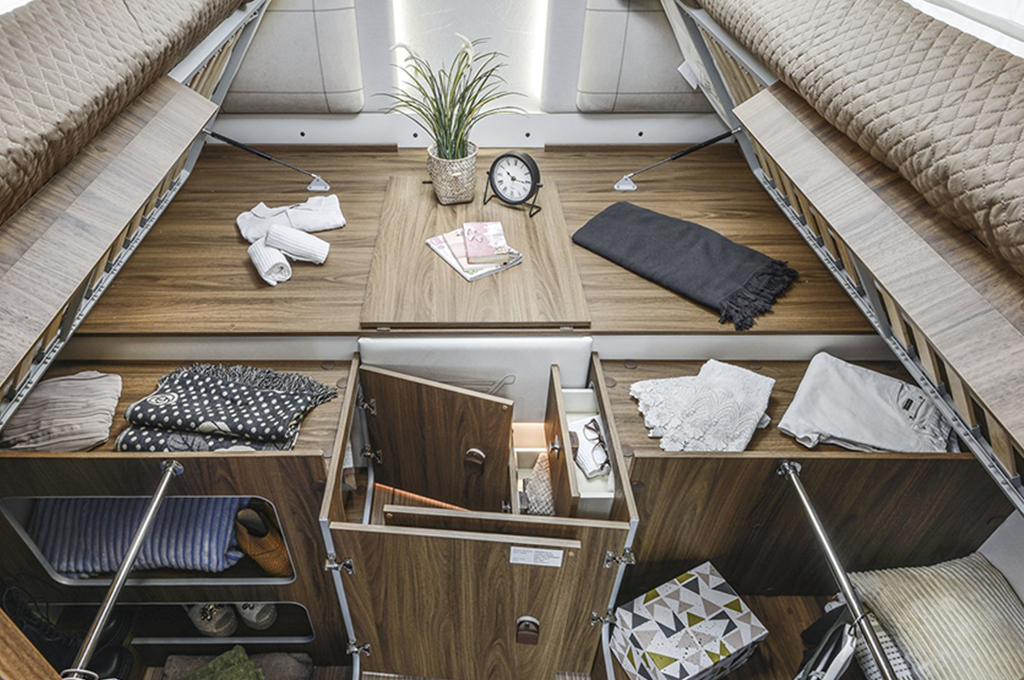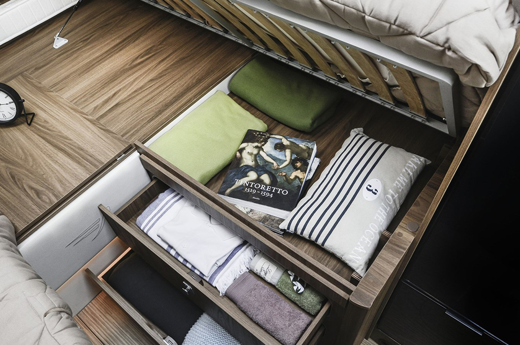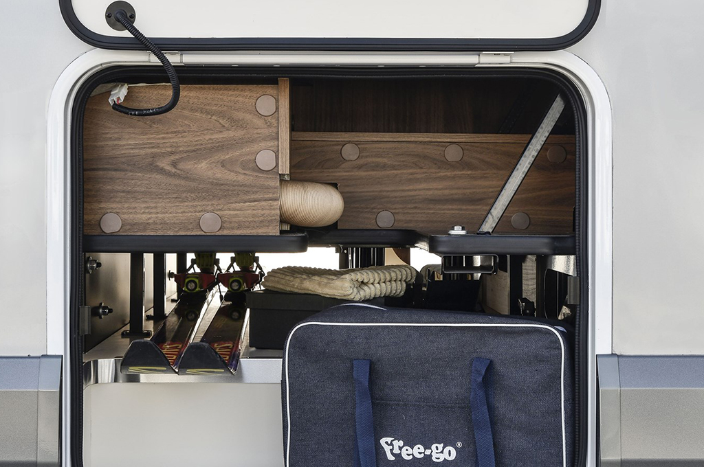 La tecnologia VEX del frontale in vetroresina assicura solidità, rigidità e silenziosità durante il viaggio, mentre il doppio stivaggio con una capacità di 688 litri offre ampio spazio per riporre oggetti. I serbatoi sono protetti dal gelo grazie alla loro posizione tra i due pavimenti, assicurando che rimangano isolati dall'esterno. La separazione netta tra camera e garage evita cattivi odori, mantenendo un ambiente interno pulito e confortevole.