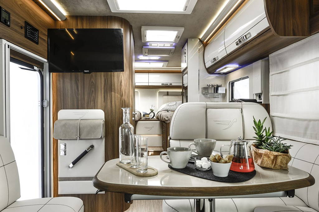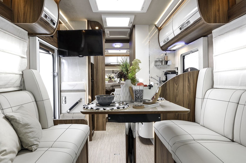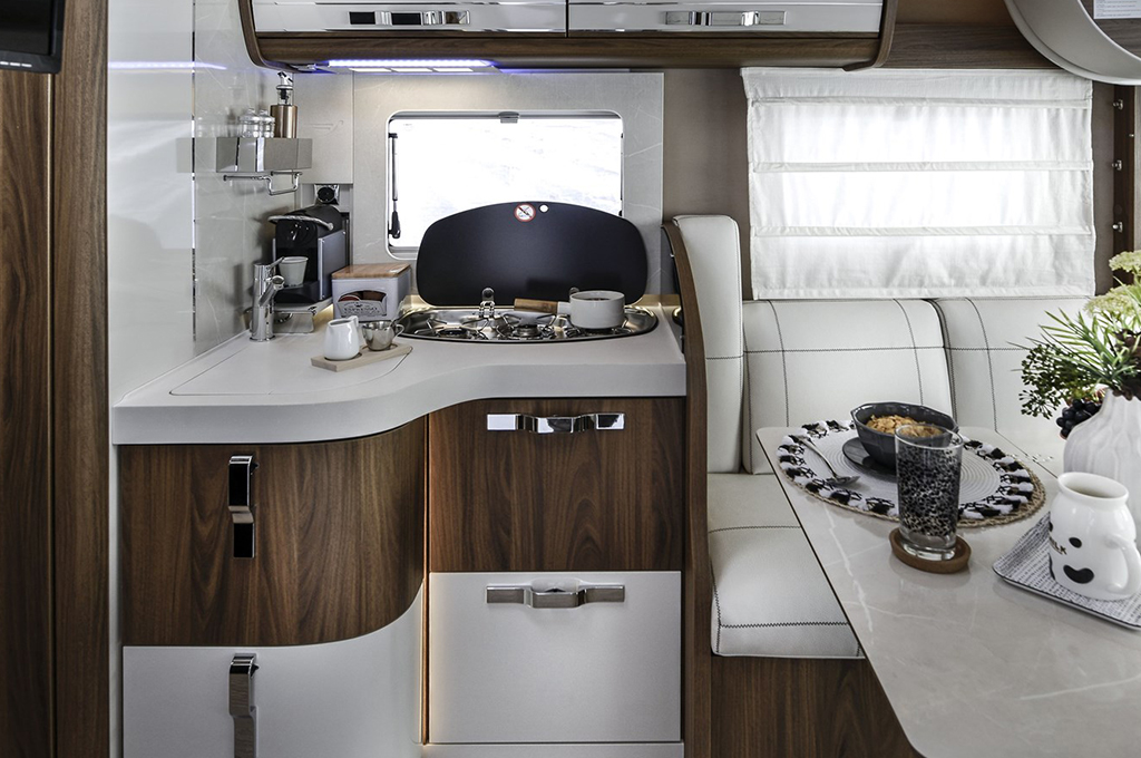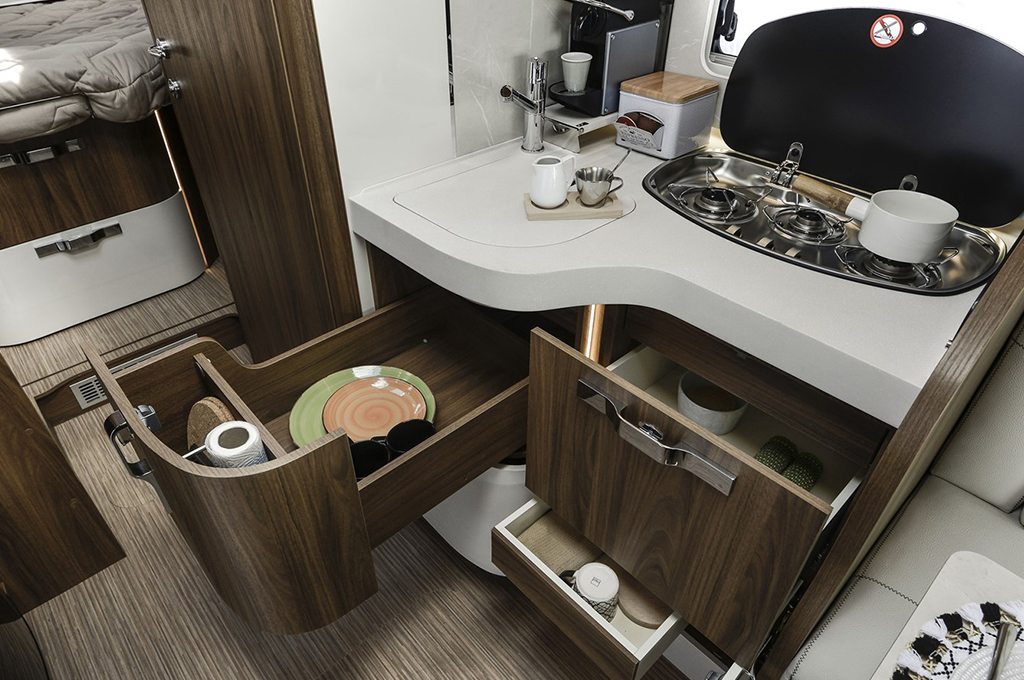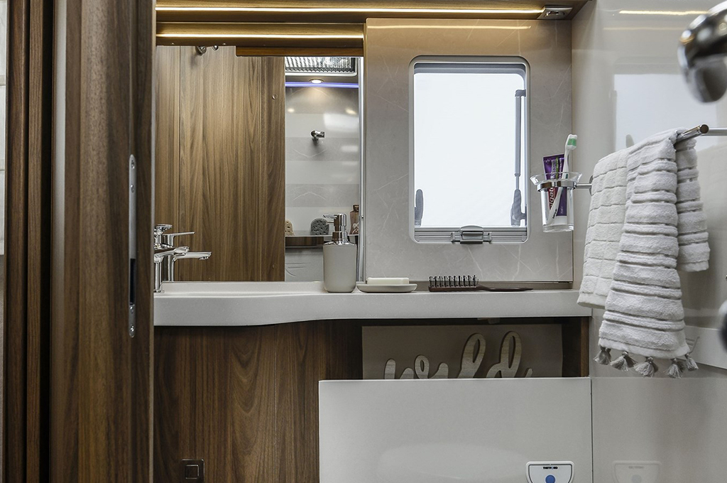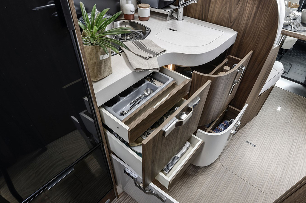 La tecnologia VEX del frontale in vetroresina assicura solidità, rigidità e silenziosità durante il viaggio, mentre il doppio stivaggio con una capacità di 688 litri offre ampio spazio per riporre oggetti. I serbatoi sono protetti dal gelo grazie alla loro posizione tra i due pavimenti, assicurando che rimangano isolati dall'esterno. La separazione netta tra camera e garage evita cattivi odori, mantenendo un ambiente interno pulito e confortevole.