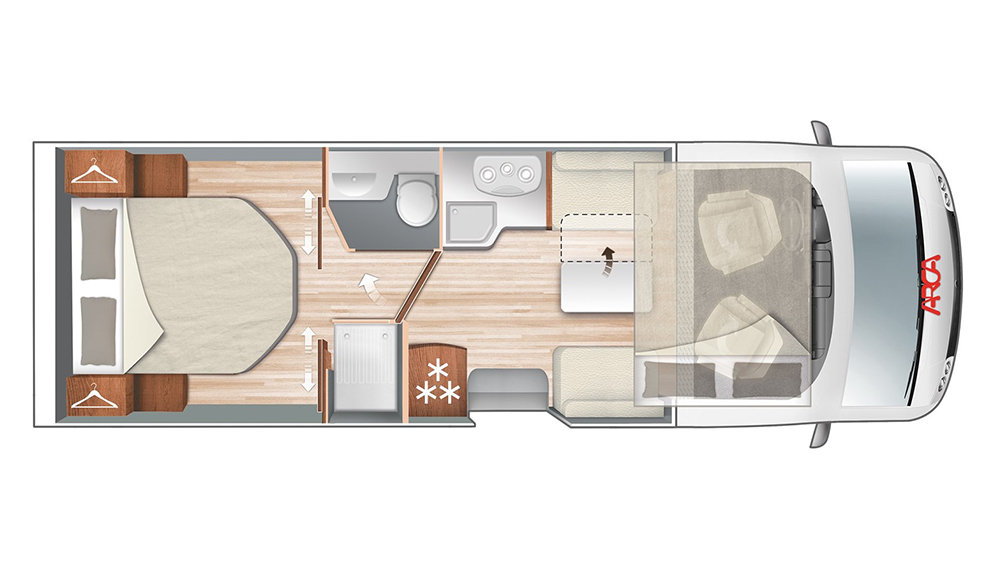 Sotto il cofano, la meccanica Fiat Ducato con motorizzazione da 140 CV assicura prestazioni elevate e una guida fluida e confortevole. Con un peso a vuoto di 3138 kg e dimensioni esterne di 7500 mm di lunghezza e 2350 mm di larghezza, Arca Europa New Deal H 745 GLC offre spazio sufficiente per una vacanza in totale comodità, con posti letto omologati per 4 persone e un'opzione per un quinto posto letto nella dinette trasformabile.