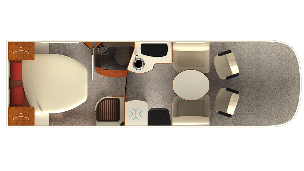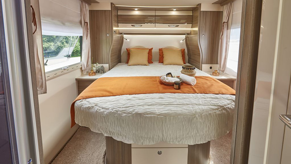 L'arredamento di alta qualità con ante bicolore conferisce un tocco di eleganza all'ambiente interno, mentre l'illuminazione a LED a basso consumo crea un'atmosfera accogliente. Il letto centrale XXL offre il massimo comfort durante il sonno, mentre i quattro sedili "automobilistici" dotati di ancoraggi ISOFIX assicurano la sicurezza durante il viaggio.