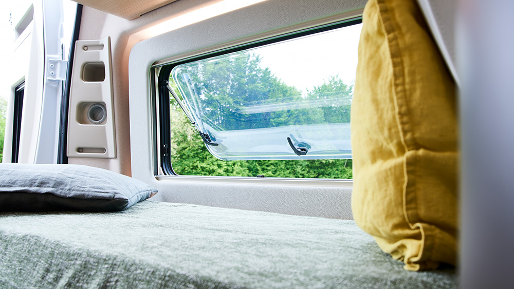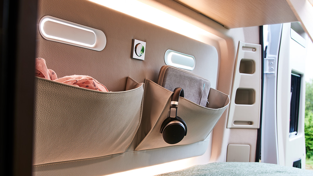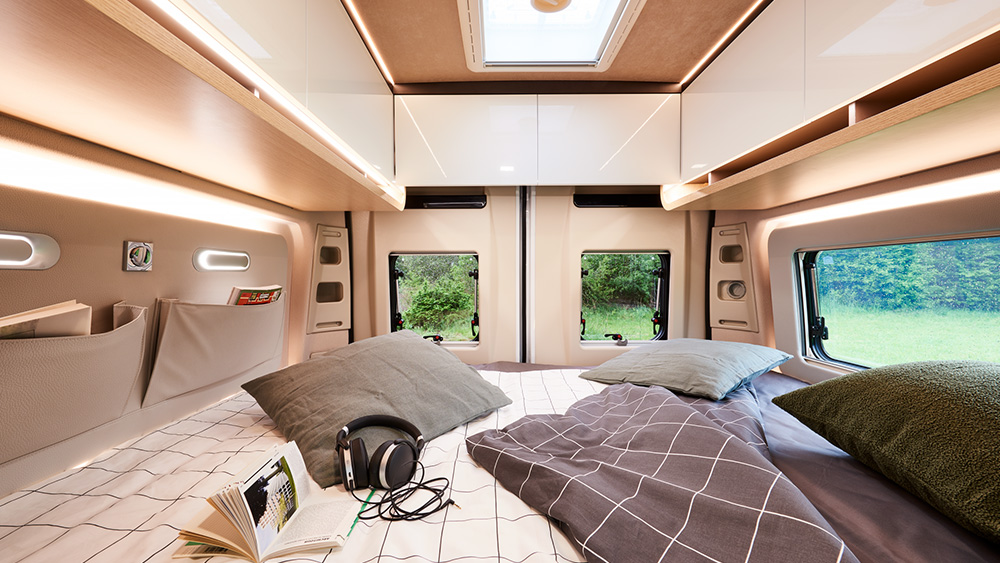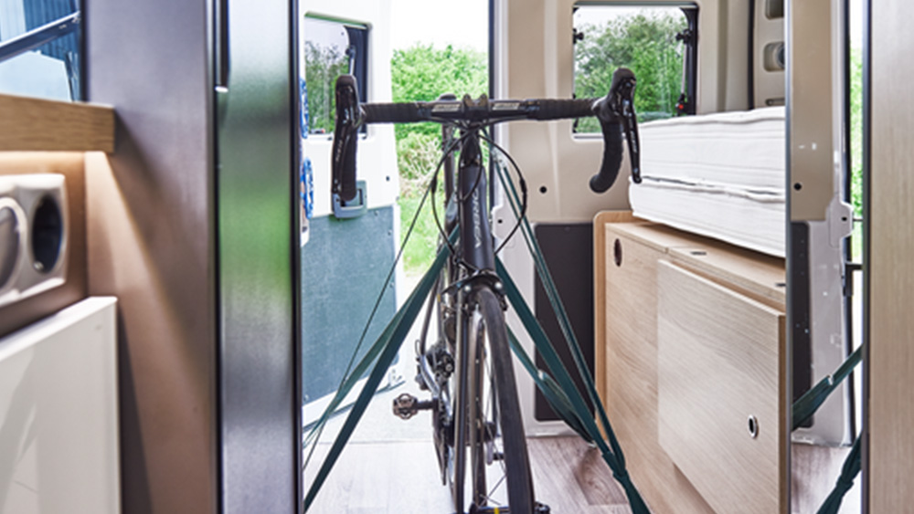 Una delle caratteristiche distintive di questo van è il letto trasversale posteriore rimovibile, che può essere facilmente convertito per ospitare una tavola da surf o una bicicletta, consentendo di trasportare gli oggetti ingombranti senza compromettere lo spazio vitale all'interno del veicolo.