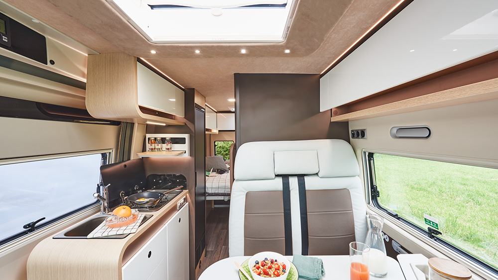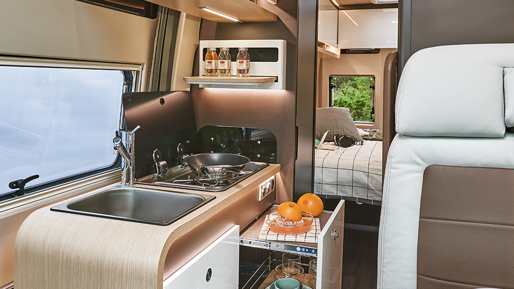 La cucina è un esempio di design e funzionalità, con ampio spazio di archiviazione e un piano di lavoro supplementare per preparare i pasti in modo comodo e efficiente anche durante i viaggi più lunghi. L'illuminazione d'atmosfera indiretta con LED a basso consumo conferisce un'atmosfera accogliente e rilassante all'interno del van, perfetta per creare un'ambientazione confortevole durante le serate in campeggio.
