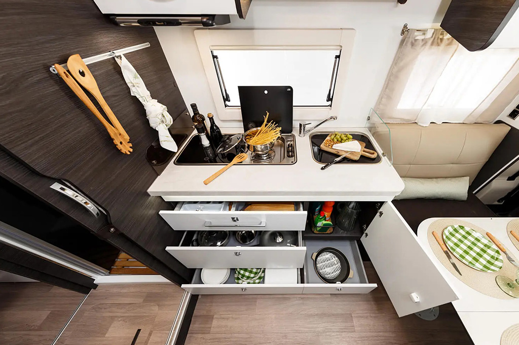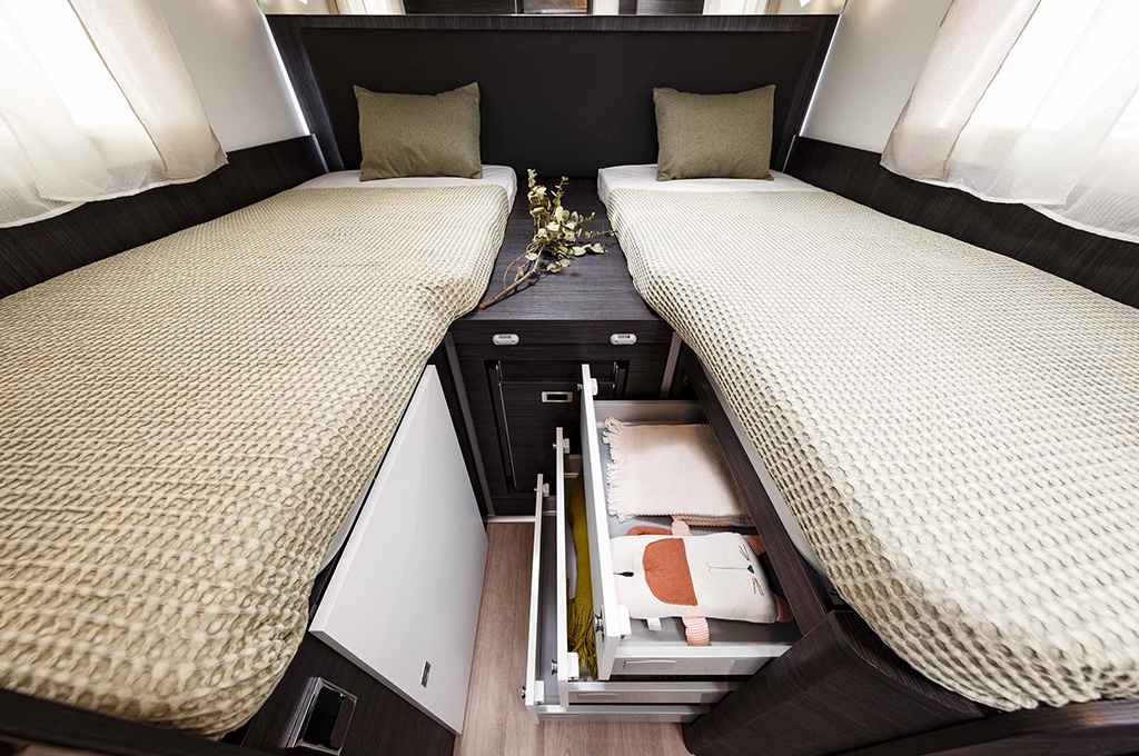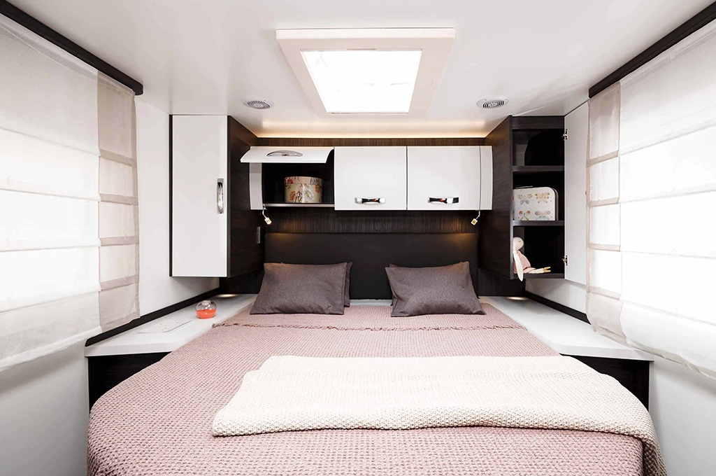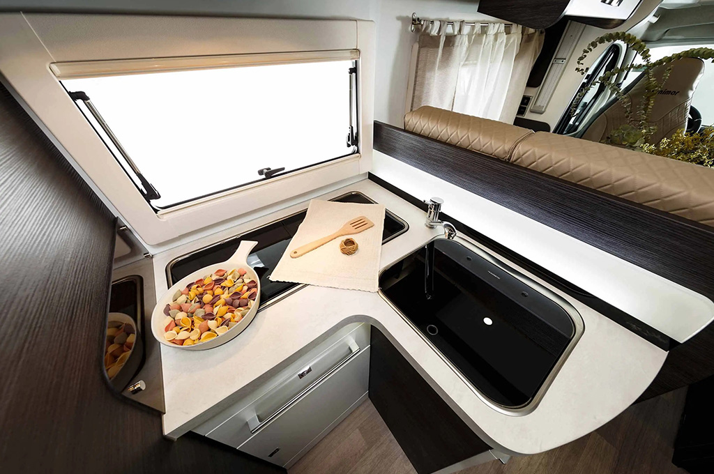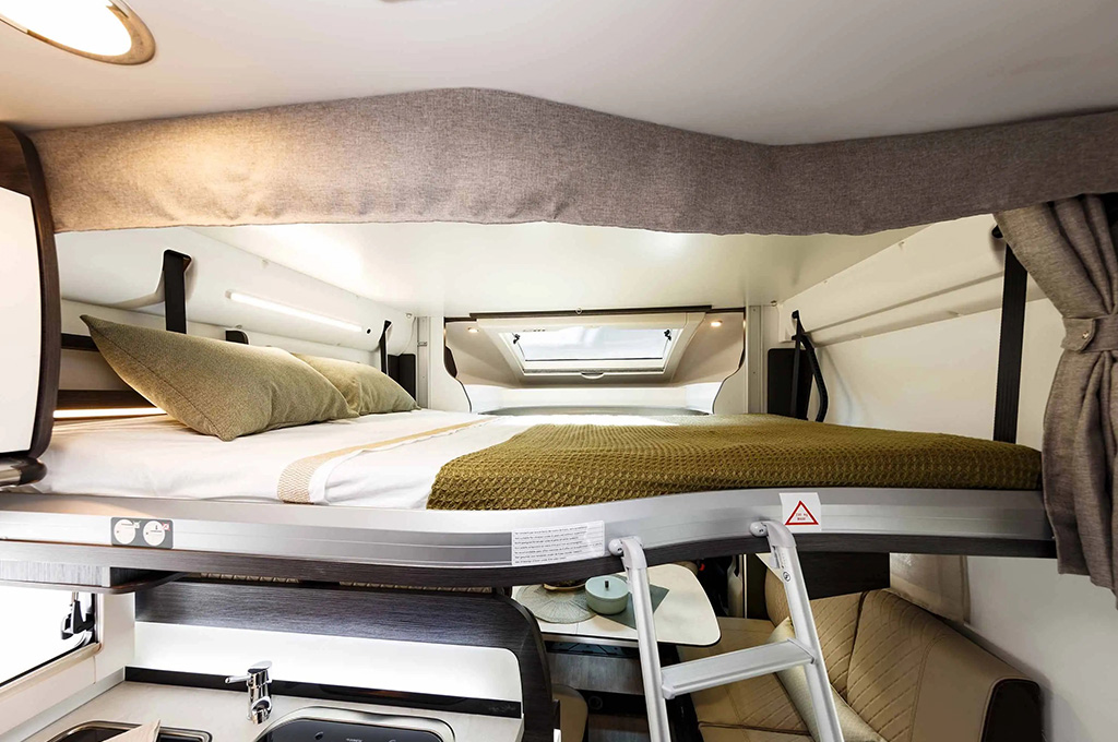 Il sonno è garantito a cinque stelle, grazie a letti matrimoniali o centrali che assicurano il massimo comfort durante il riposo. La cucina è un'area di fantasia, completa di piano cottura a 3 fuochi, aspiratore e una spaziosa dispensa, che permette di preparare deliziosi pasti anche durante i viaggi più lunghi.