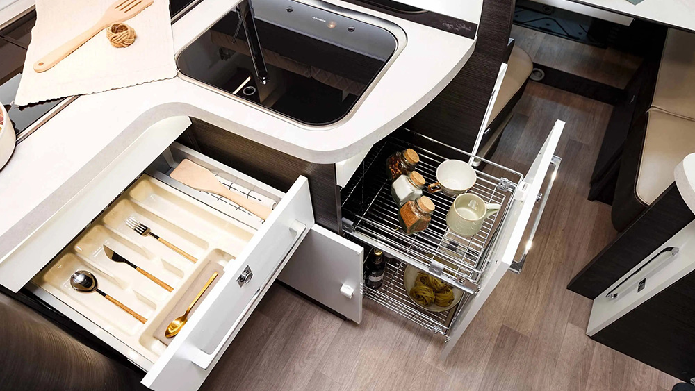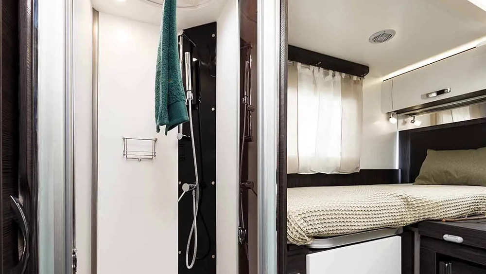La cucina ad L è progettata per massimizzare lo spazio e la funzionalità, con una cappa aspirante, un ampio cestello metallico estraibile e un frigorifero da 140 litri con un cassetto separato per le bevande. Il bagno separato con doccia offre comfort e privacy, mentre il garage spazioso e accessibile dall'interno del veicolo consente di trasportare facilmente attrezzature e bagagli extra.