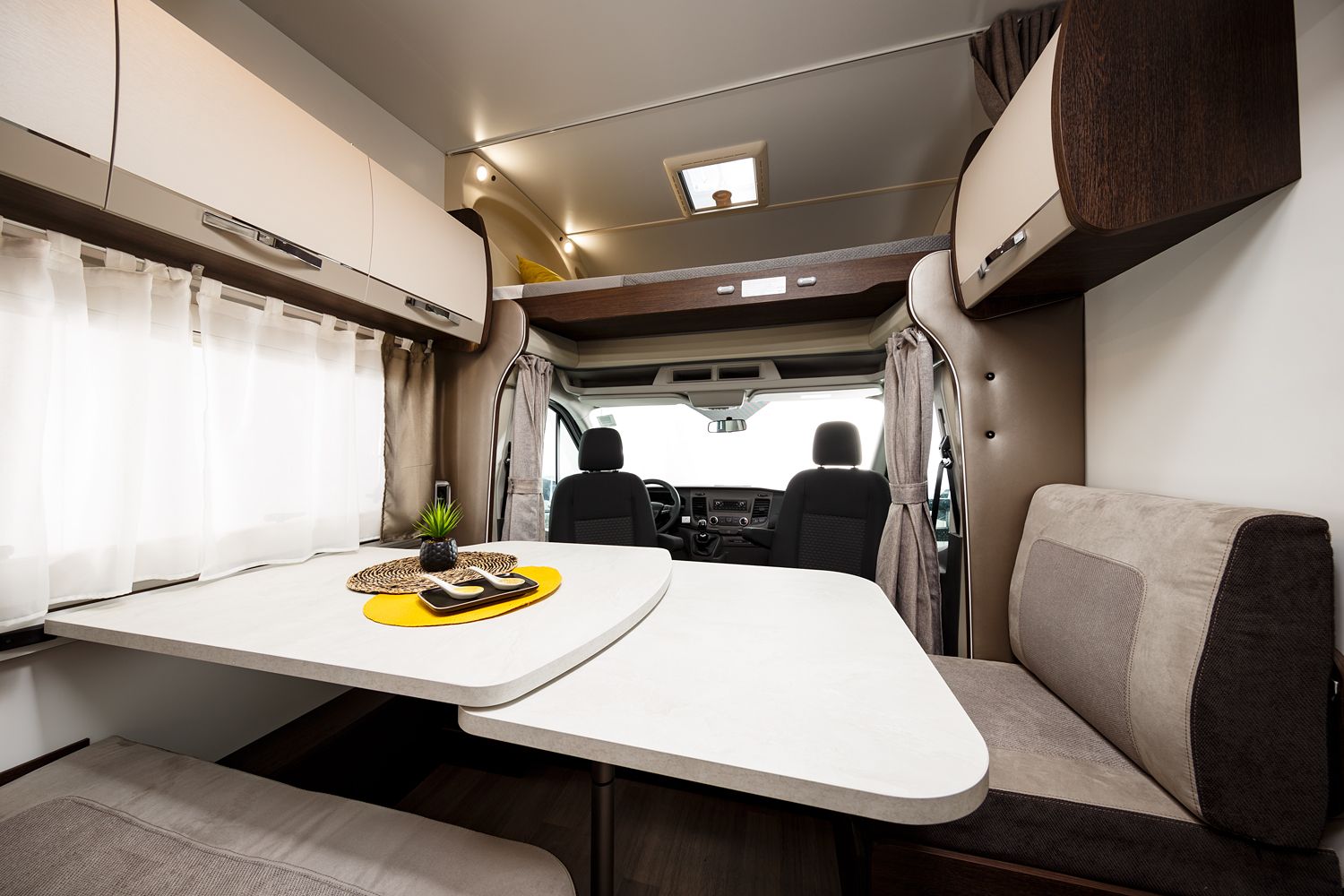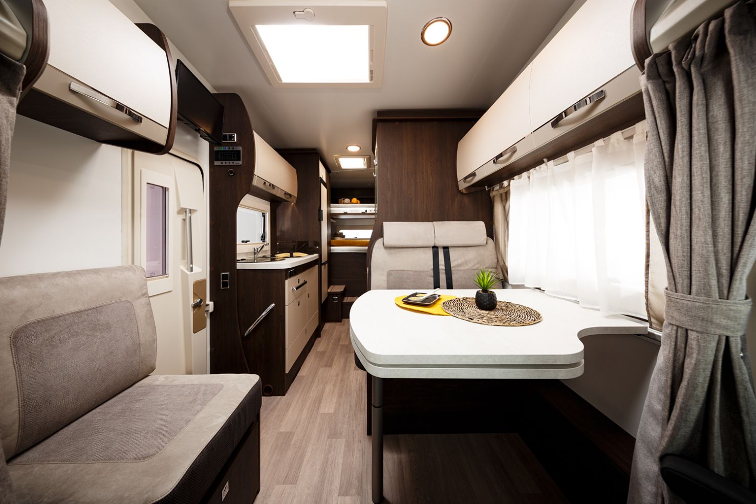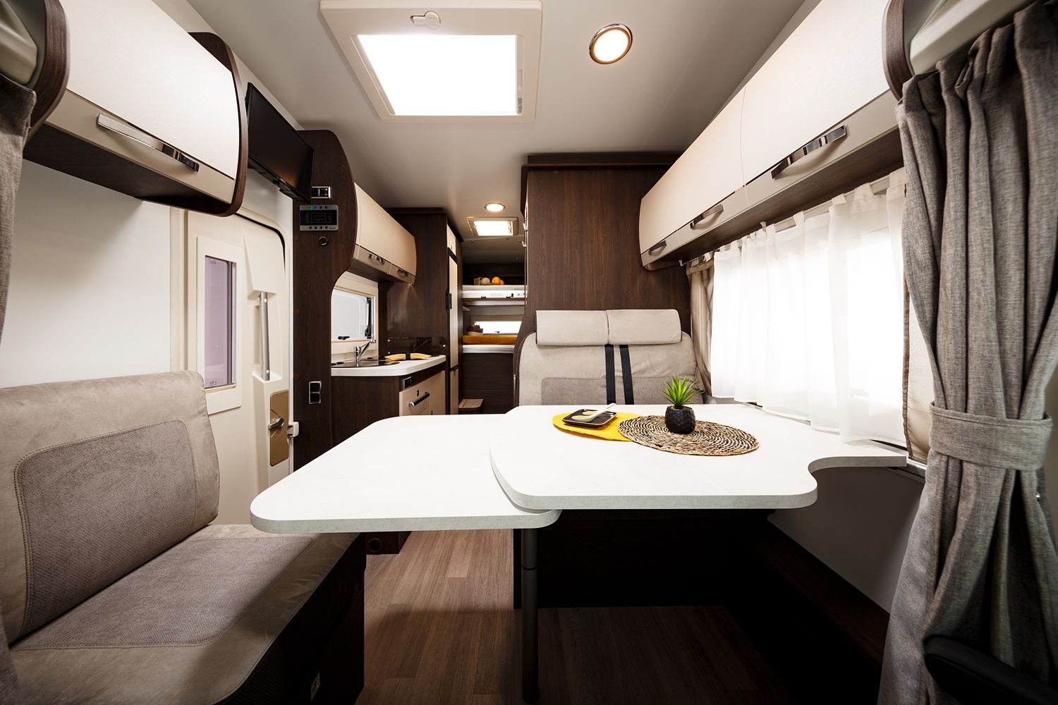 Nel cuore di questo veicolo c'è uno spazioso e ben attrezzato salone, dove un grande tavolo con prolunga offre un luogo invitante per condividere pasti, giocare a carte o pianificare le avventure del giorno successivo. Gli interni sono caratterizzati da una nuova tappezzeria PHOENIX e un nuovo ambiente interior PAMPLONA, che aggiungono un tocco di eleganza e modernità all'ambiente circostante.