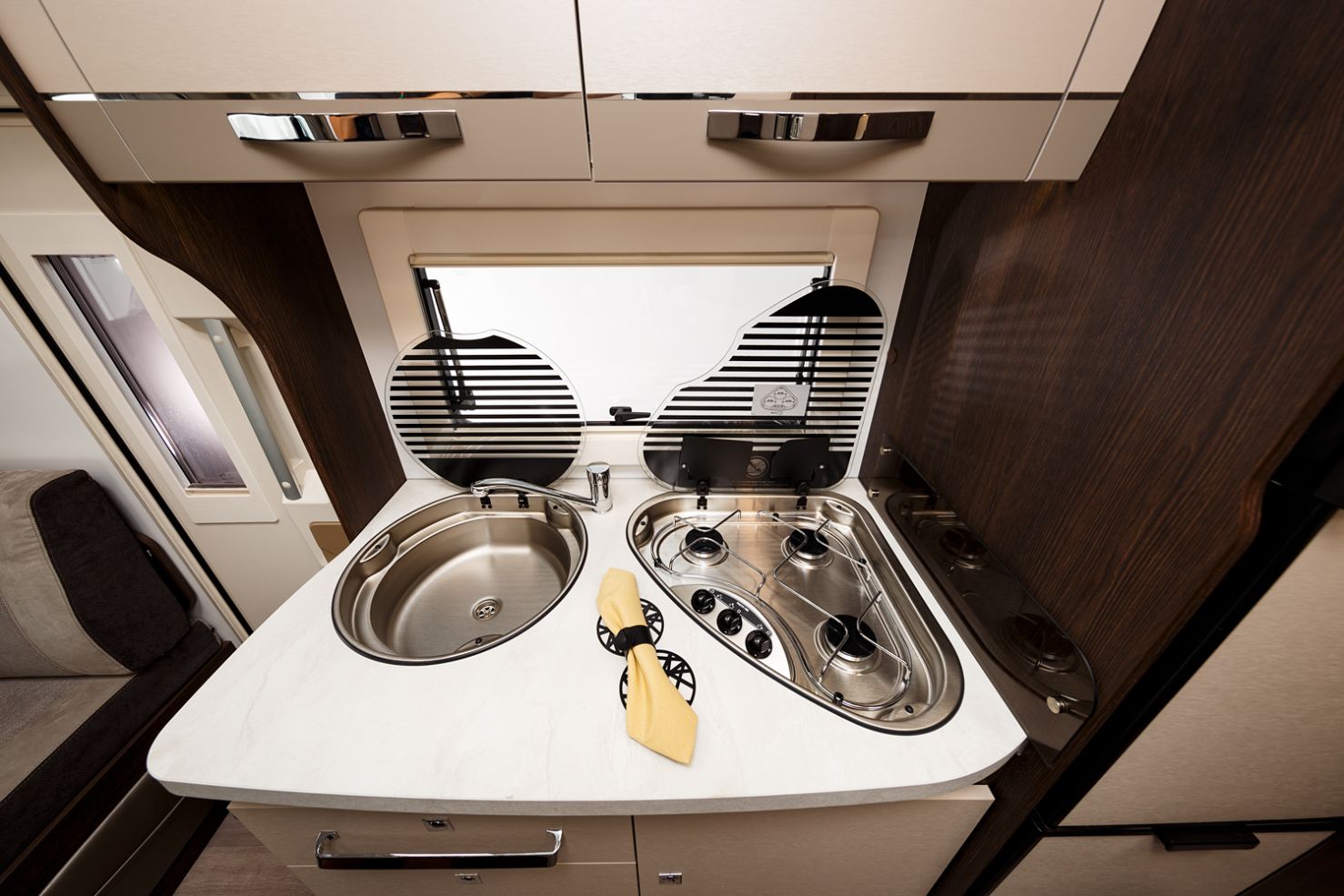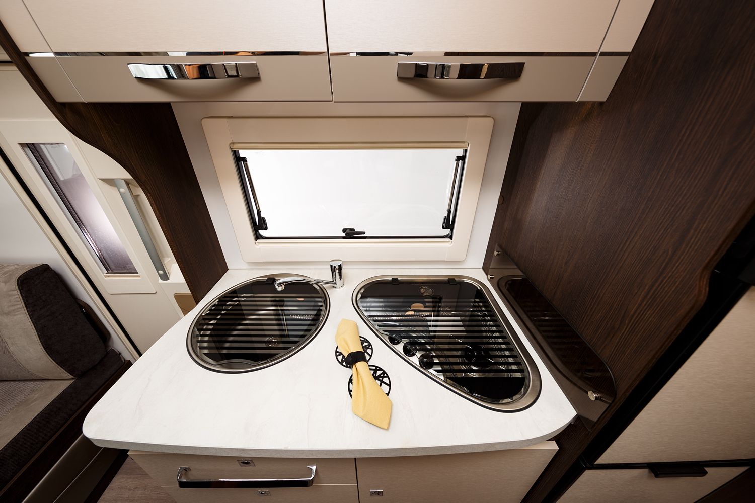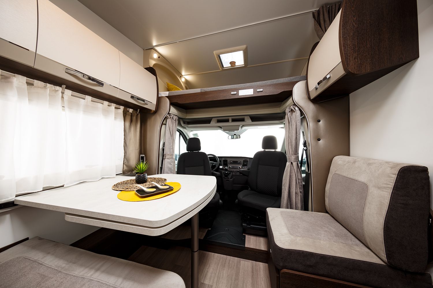 Nel cuore di questo veicolo c'è uno spazioso e ben attrezzato salone, dove un grande tavolo con prolunga offre un luogo invitante per condividere pasti, giocare a carte o pianificare le avventure del giorno successivo. Gli interni sono caratterizzati da una nuova tappezzeria PHOENIX e un nuovo ambiente interior PAMPLONA, che aggiungono un tocco di eleganza e modernità all'ambiente circostante.
