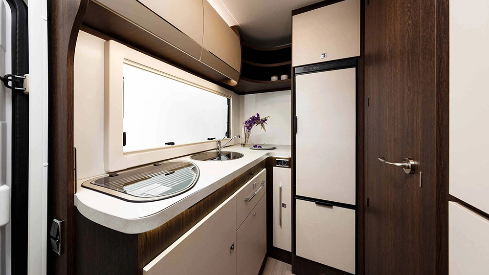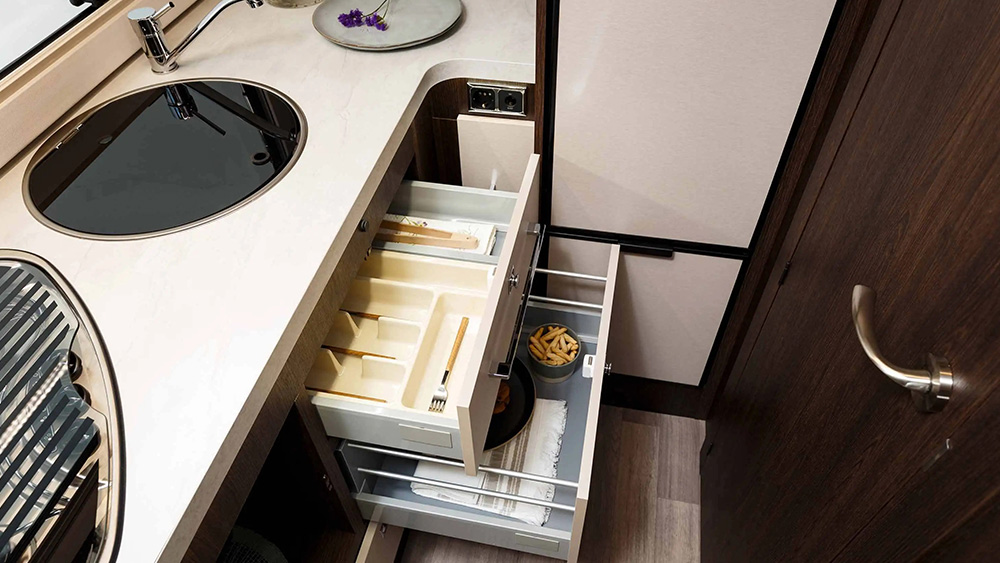 La cucina ad L è ben attrezzata e funzionale, con un grande frigorifero da 140 litri e un pratico cassetto per bottiglie di grandi dimensioni. Il bagno offre una doccia separata e spaziosa, arricchita da una finestra per una migliore ventilazione e luminosità.