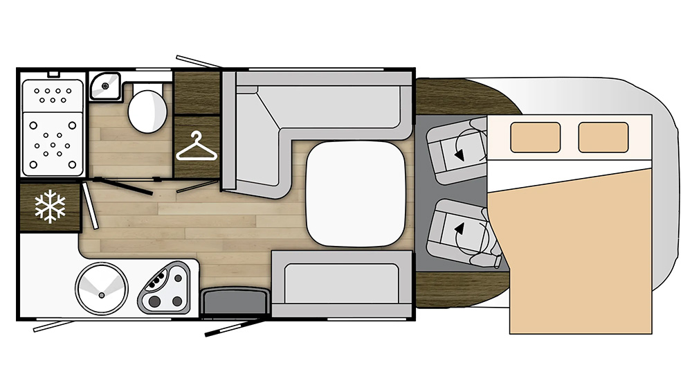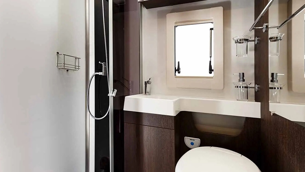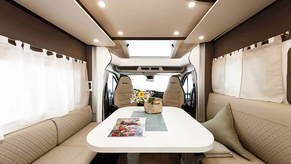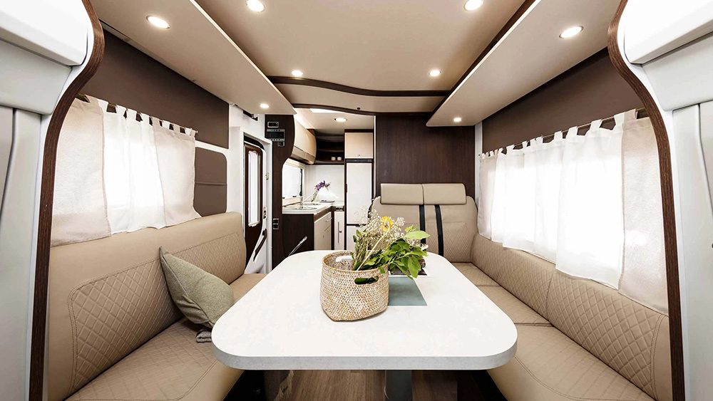L'interno è progettato per massimizzare il comfort e la praticità. La dinette a L offre un'area conviviale per mangiare e rilassarsi, con pratici sistemi ISOFIX integrati per garantire la sicurezza dei passeggeri. Il pie de mesa centrale è regolabile in altezza elettricamente, offrendo flessibilità per adattarsi alle diverse esigenze degli occupanti.