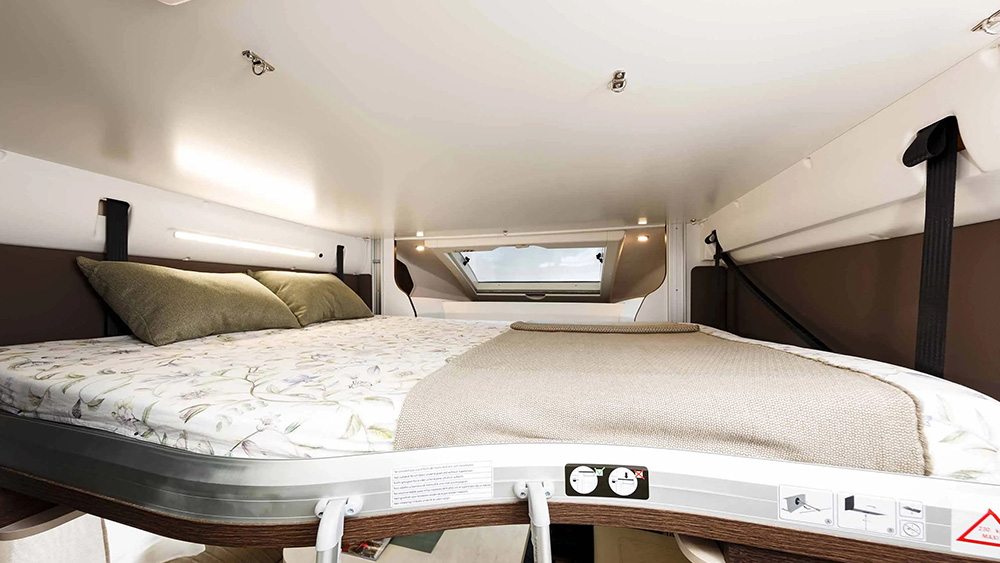 Una delle caratteristiche distintive di questo veicolo è la sua flessibilità. Il letto basculante elettrico a due posti, con una capacità massima di 230 kg, si alza e si abbassa con facilità, consentendo di utilizzare lo spazio sottostante durante il giorno. Inoltre, la comoda cama de techo si abbassa fino all'altezza del divano, eliminando la necessità di scale e migliorando l'accessibilità.