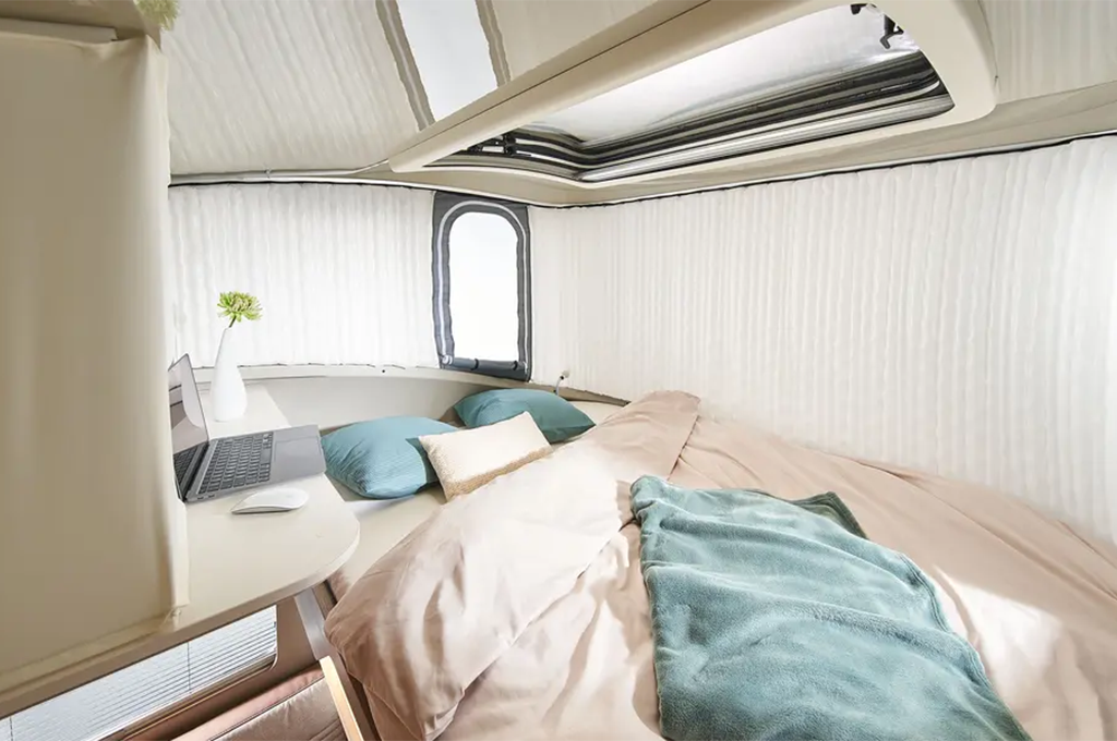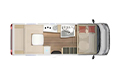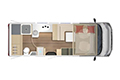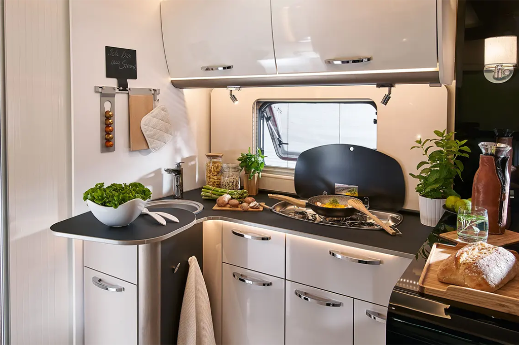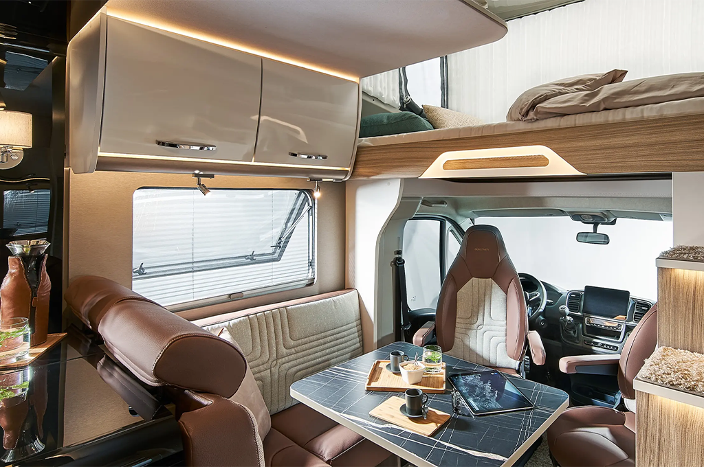 All'interno, l'arredamento grigio sabbia con piani di lavoro e tavolo scuro offre un ambiente moderno e accogliente. La cucina, completa di un fornello spazioso e un frigorifero a compressione fino a 175 litri, assicura che non manchi mai lo spazio per conservare alimenti freschi. Punti di forza come il volante e il pomello del cambio in cuoio, il logo ricamato Harmony Line e lo spazio bar con applique murale e stazione Home Light riflettono un design sofisticato e curato nei dettagli.