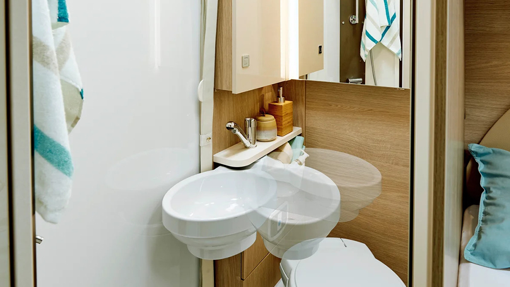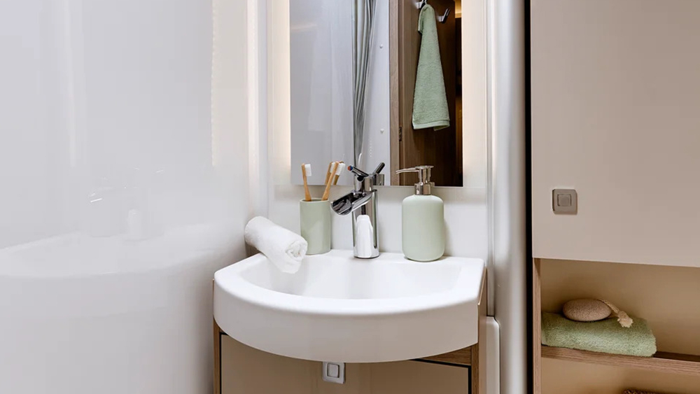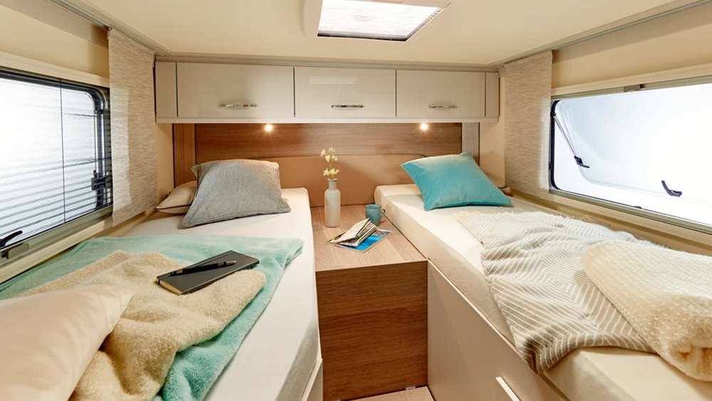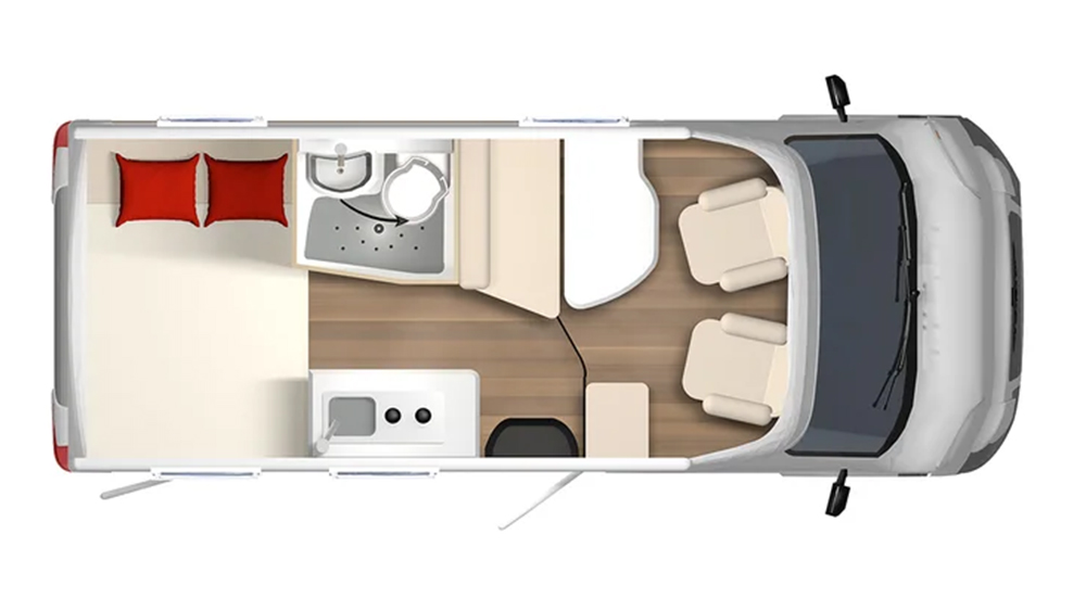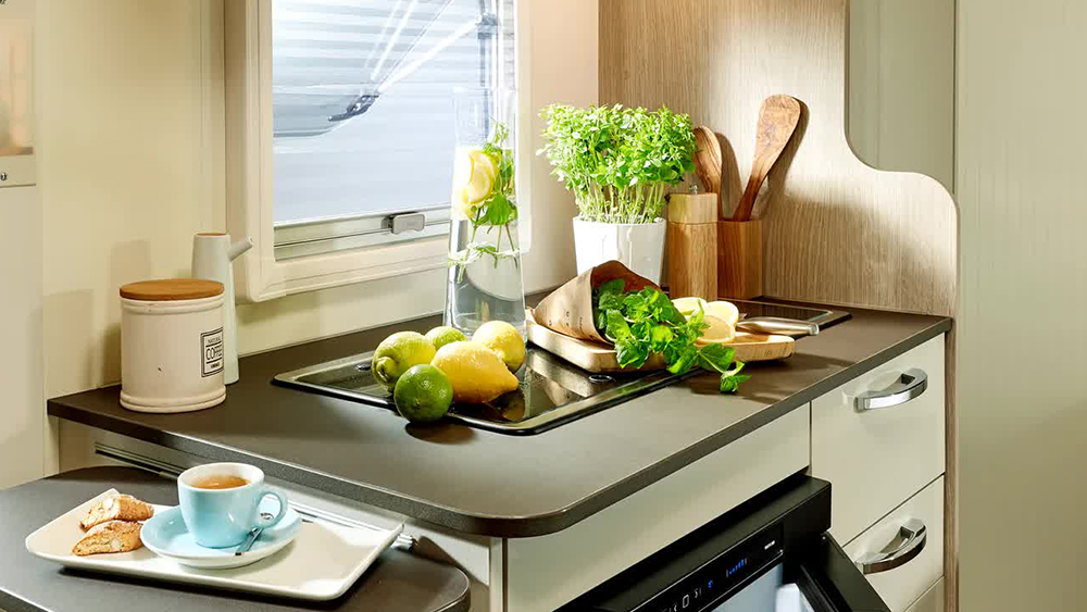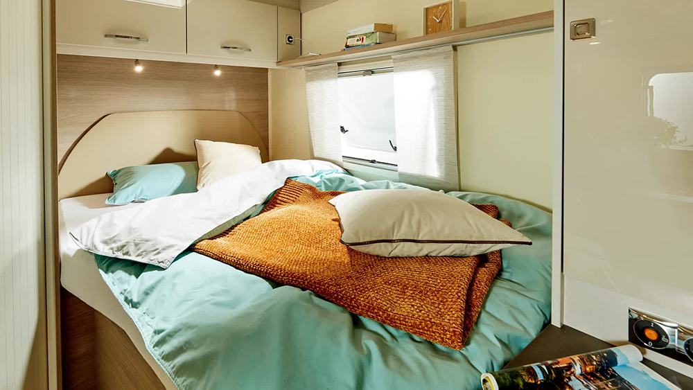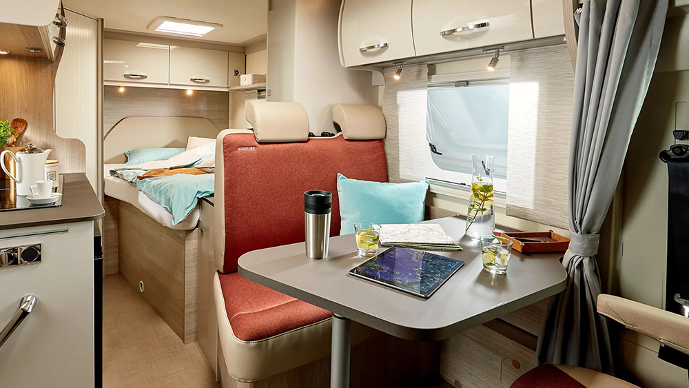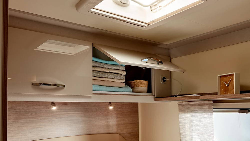 Realizzato con materiali di alta qualità e caratterizzato da colori chiari e soluzioni intelligenti, il Nexxo Van crea un ambiente spazioso e accogliente. Il tavolo girevole, abbassabile per trasformarsi in un letto aggiuntivo, insieme al salotto centrale (escluso nell'allestimento T 569), offre flessibilità e comfort aggiuntivo. Inoltre, l'opzionale tetto apribile permette all'abbondante luce naturale di filtrare all'interno, amplificando la sensazione di libertà.