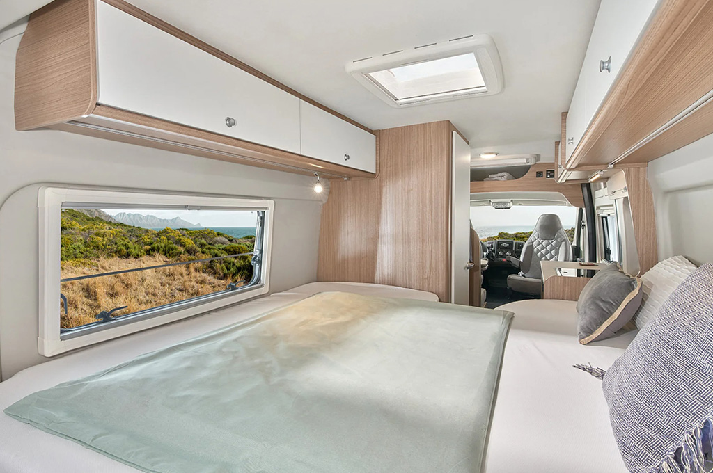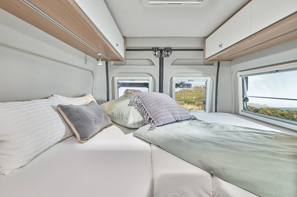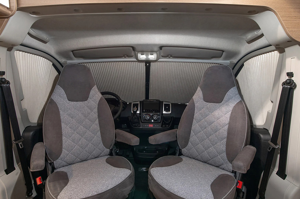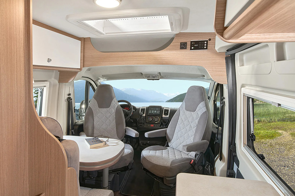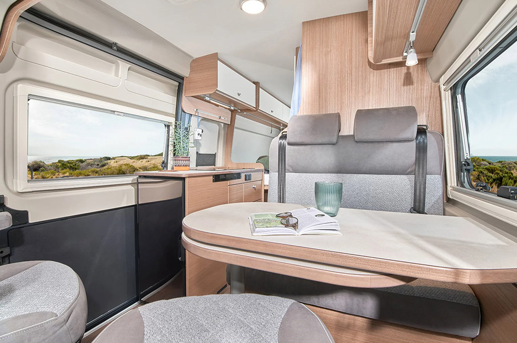 Nella zona giorno, i sedili girevoli e gli spazi di stivaggio integrati creano rapidamente una dinette accogliente, mentre la zona notte offre materassi di alta qualità per un riposo rigenerante. La cucina, ridotta alla sua essenzialità, include un piano di cottura a 2 fornelli e un frigorifero a compressore, ideale per preparare pasti anche in spazi contenuti.