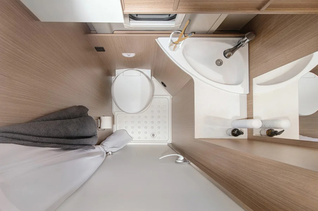 Il bagno, una vera "spa compatta", dispone di lavandino fisso e WC a cassetta, arricchito da luci LED e un oblo' sul soffitto per un'atmosfera rilassante. La serie CV si distingue anche per il suo design moderno ed estetico, con tessuti robusti e resistenti ai raggi UV, disponibili in una gamma di colori vivaci.