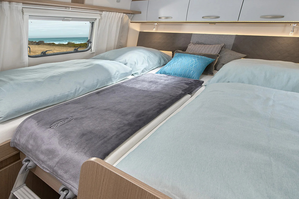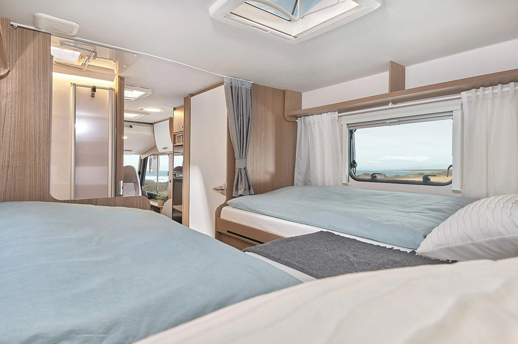 Nella zona giorno, il comfort è al centro dell'esperienza di viaggio: illuminazione indiretta, dettagli pregiati e un design che trasforma ogni viaggio in un sogno. La zona notte offre letti basculanti con elementi Clima Plux e materassi di alta qualità per assicurare notti ristoratrici.