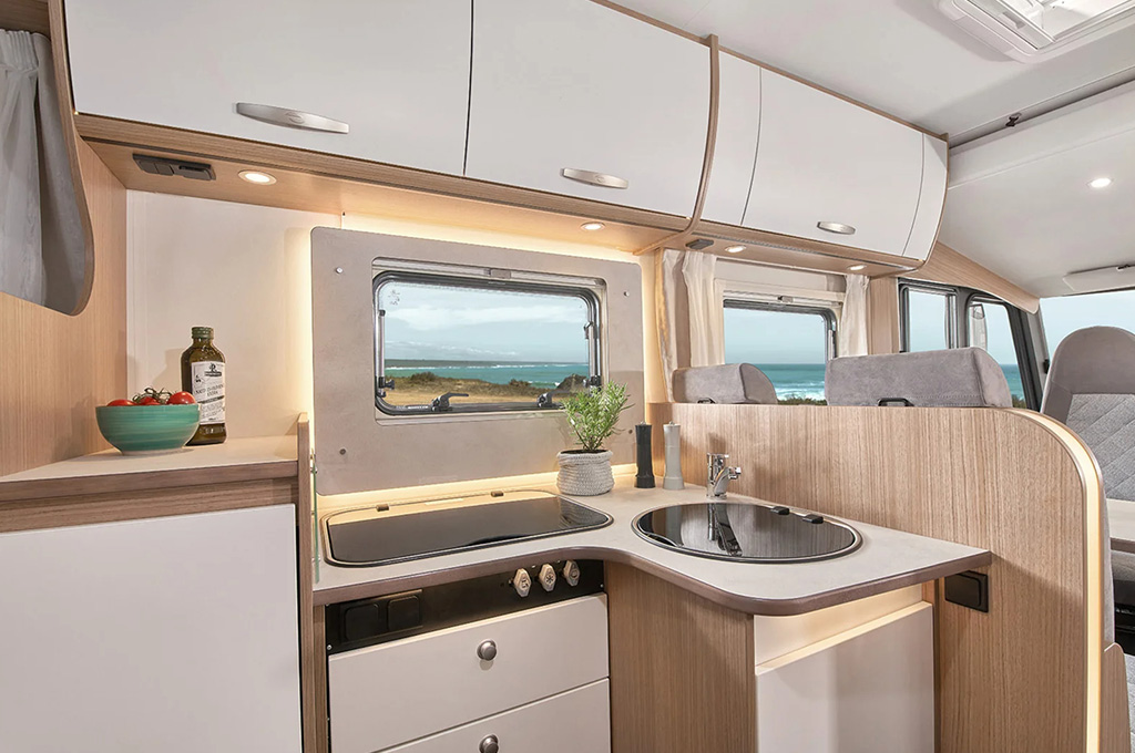 La cucina è un invito a gustare il viaggio: ergonomicamente progettata con abbondanti superfici d'appoggio e di lavoro, dotata di piano cottura a due fornelli, cassettoni spaziosi e un frigorifero con freezer per conservare le prelibatezze di viaggio.