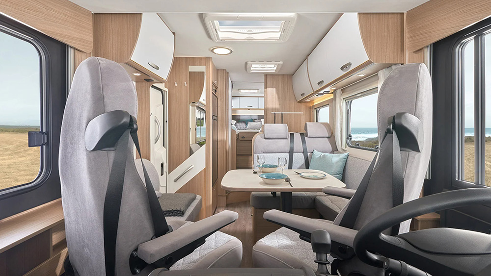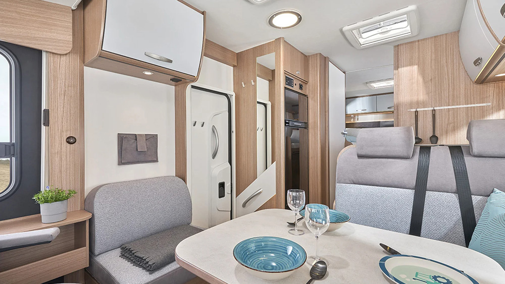 L'interno del Carado I447 è progettato per offrire il massimo comfort durante il viaggio. La zona giorno accogliente è caratterizzata da una dinette funzionale intorno al tavolo, che può essere rapidamente allestita ruotando i sedili guida e passeggero. La cucina ad angolo, dotata di piastra di cottura a 2 fornelli, offre comfort e praticità, con tutto a portata di mano per preparare deliziose pietanze durante il viaggio.