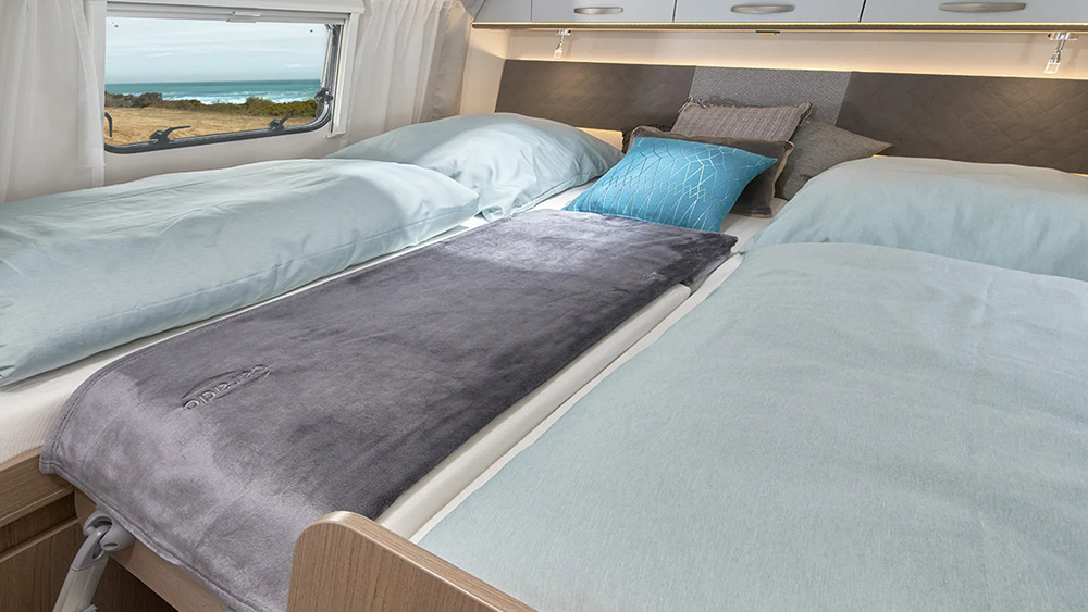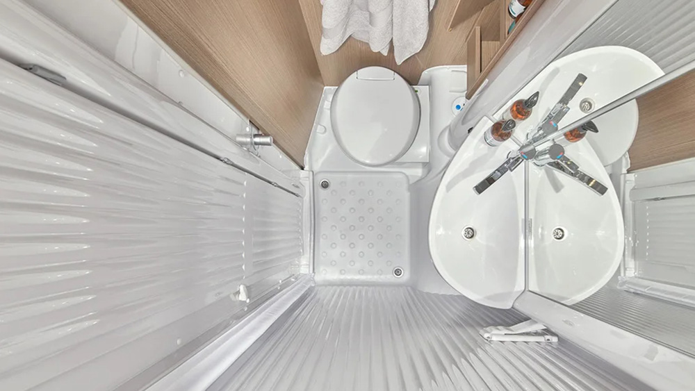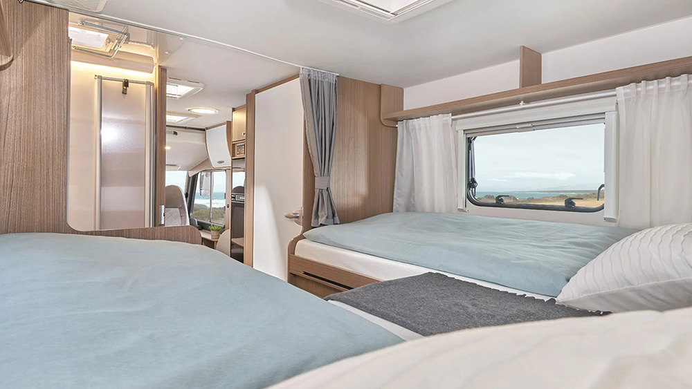 La zona notte offre un'oasi di relax, con un letto basculante di serie e letti singoli extra lunghi sul retro, completi di comodi materassi di alta qualità per garantire un sonno riposante. Il bagno spazioso è dotato di doccia separata, per un comfort totale anche nei viaggi più lunghi.