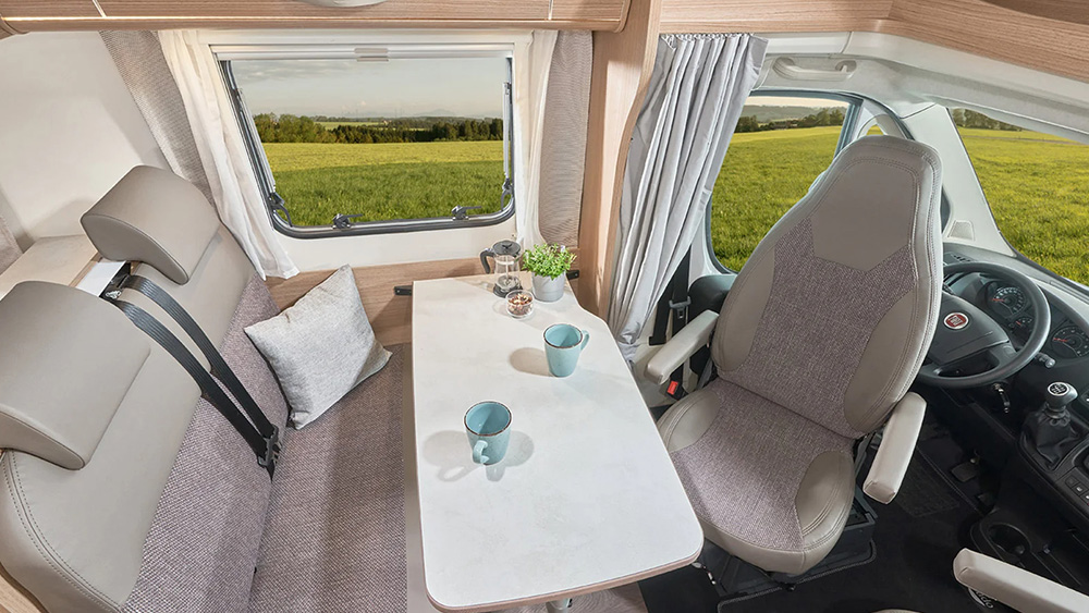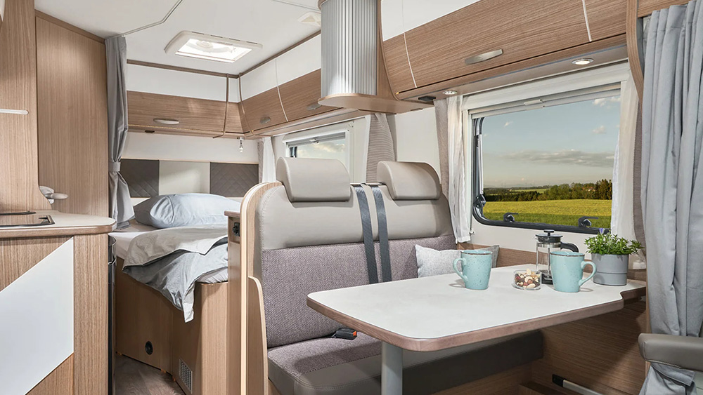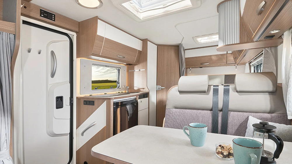 Il Carado T135 offre posti letto per due persone grazie a un comodo letto alla francese nella parte posteriore, che misura 200 x 135/115 cm, e una dinette semi-rotante che consente di ospitare fino a quattro persone. La cucina, disposta lateralmente, è equipaggiata con un piano cottura a 2 fuochi e un frigorifero con capacità di 78 litri, inclusi 11 litri di scomparto freezer, offrendo ampio spazio per la preparazione dei pasti.