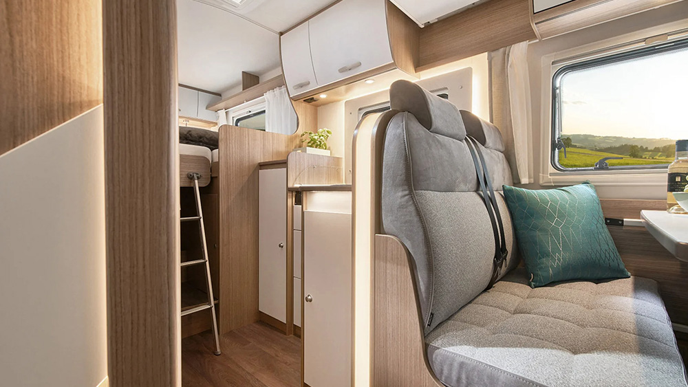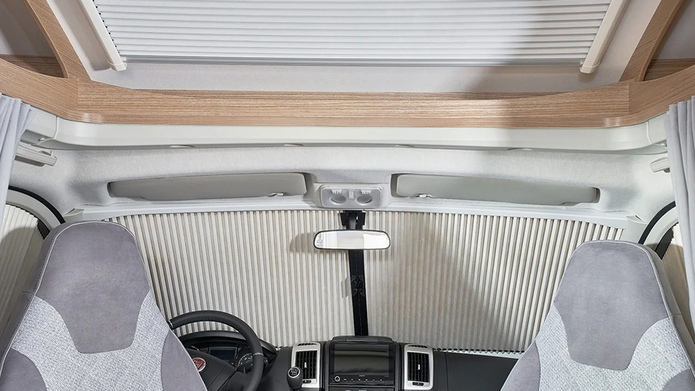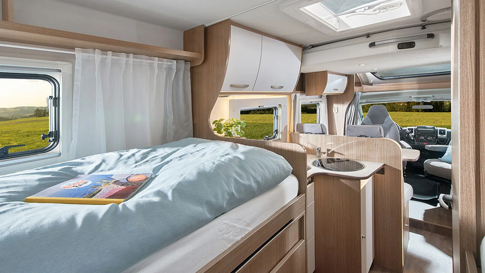 All'interno, lo spazio è ottimizzato per offrire comfort e funzionalità. La zona giorno accogliente è creata facilmente girando i sedili conducente e passeggero, trasformando l'area in una dinette attorno al tavolo funzionale. La cucina ad angolo è progettata per massimizzare la praticità, con tutto a portata di mano e una piastra di cottura a 2 fornelli che assicura una preparazione sicura e comoda dei pasti.