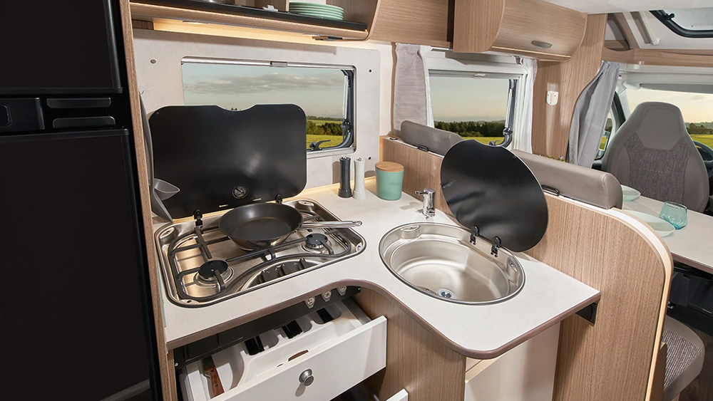 Per la sicurezza dei più piccoli, Carado T448 è dotato di ISOFIX per due sedili di serie, garantendo un ancoraggio sicuro dei seggiolini per bambini durante il viaggio. L'illuminazione interna a LED offre un basso consumo energetico e una maggiore durata della batteria, mentre i cassetti della cucina, oltre a fornire spazio di stivaggio sicuro, sono dotati di tecnologia Servo Soft per un'apertura e chiusura agevole e silenziosa.