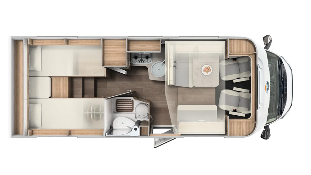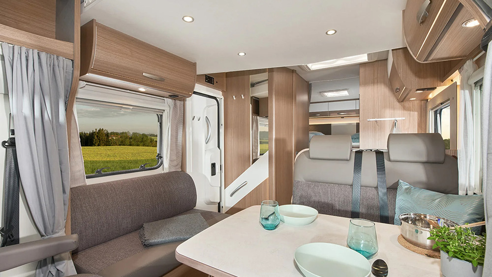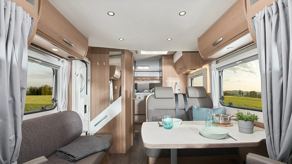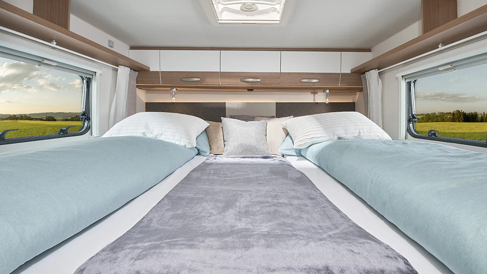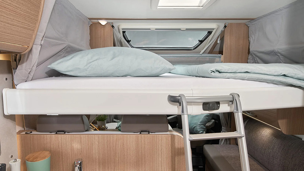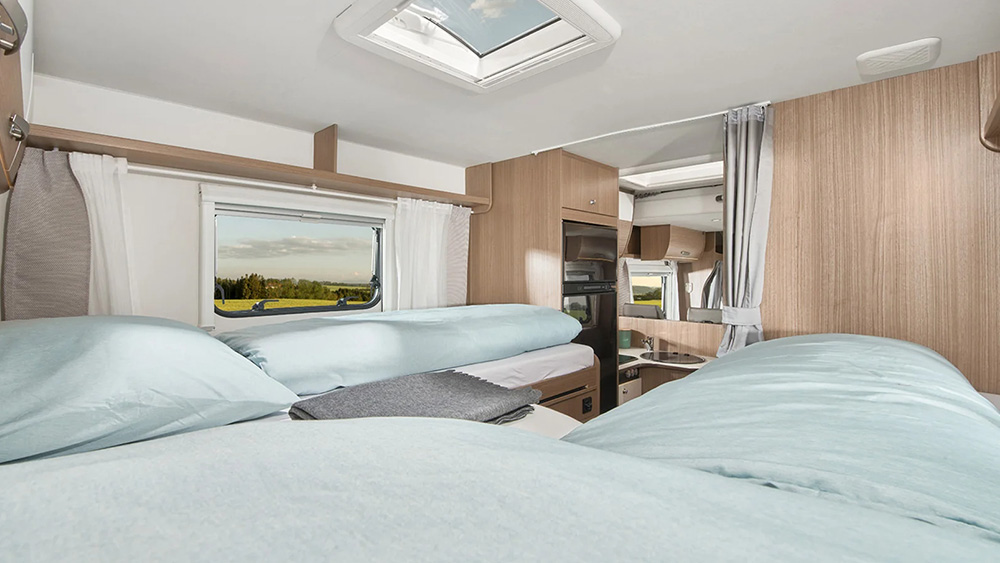 All'interno, la zona giorno è caratterizzata da sedili conducente e passeggero girevoli, una confortevole dinette e armadi intelligenti, offrendo un ambiente di lusso anche durante i lunghi viaggi. La zona notte è progettata per garantire il massimo comfort, con comodi letti singoli che possono trasformarsi in un grande letto grazie alla loro funzione estraibile.