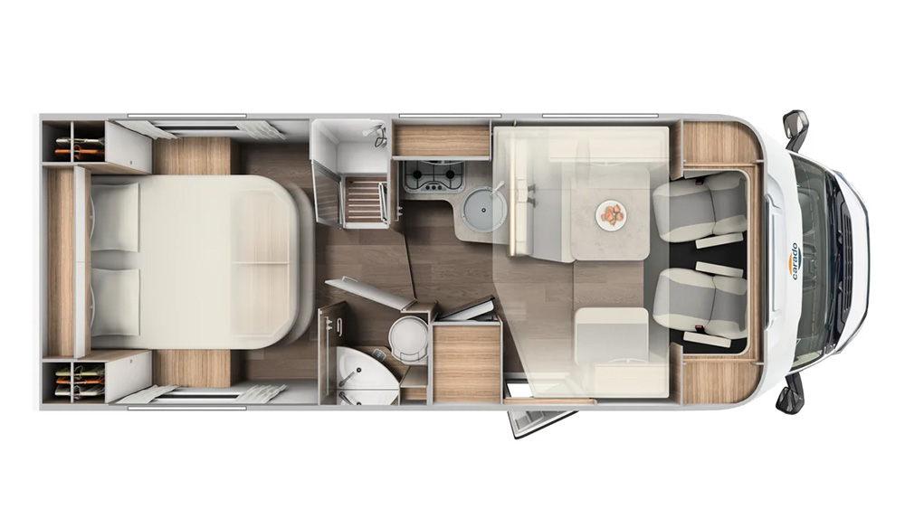 All'interno, il T449 sorprende per la sua cellula abitativa ben progettata e spaziosa, con un'altezza interna di 210 cm che offre un ambiente confortevole. La zona giorno è accogliente, con una comoda dinette perfetta per rilassarsi e socializzare. La cucina angolare è ampia e completamente attrezzata, ideale per preparare pasti deliziosi durante il viaggio.