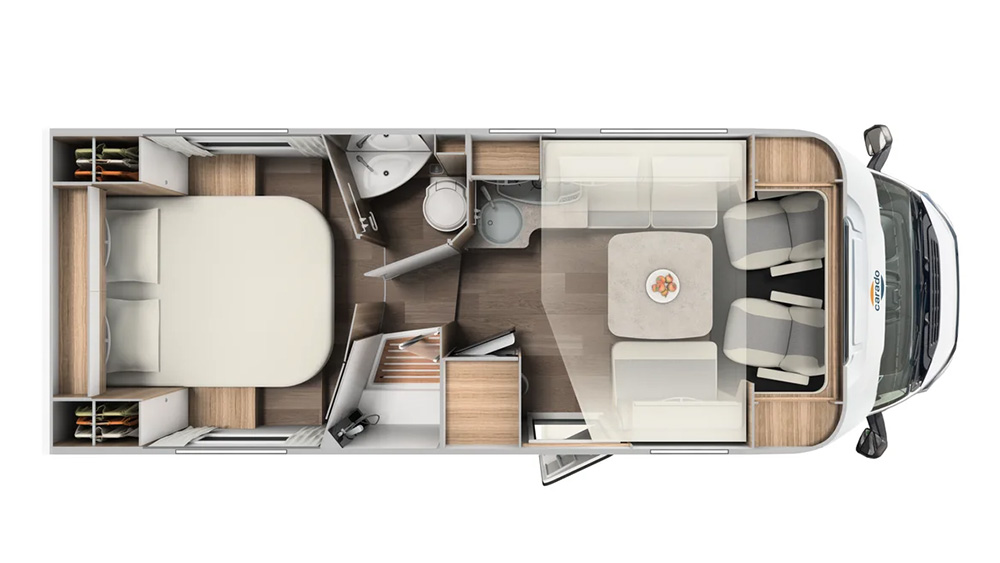 All'interno, la zona giorno accoglie con una dinette confortevole, grazie ai sedili girevoli del conducente e del passeggero. La cucina ad angolo è progettata per massimizzare la praticità, con tutto a portata di mano e una piastra di cottura a 2 fornelli per preparare deliziose pietanze durante il viaggio.