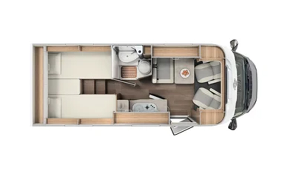 Il bagno ben studiato include numerosi vani portaoggetti per tenere tutto in ordine durante il viaggio, mentre il sistema di riscaldamento Combi 4 garantisce comfort termico in ogni momento. I letti gemelli nella zona notte sono dotati di materassi di alta qualità e rete a doghe in legno, offrendo un riposo rigenerante dopo una giornata di avventure.