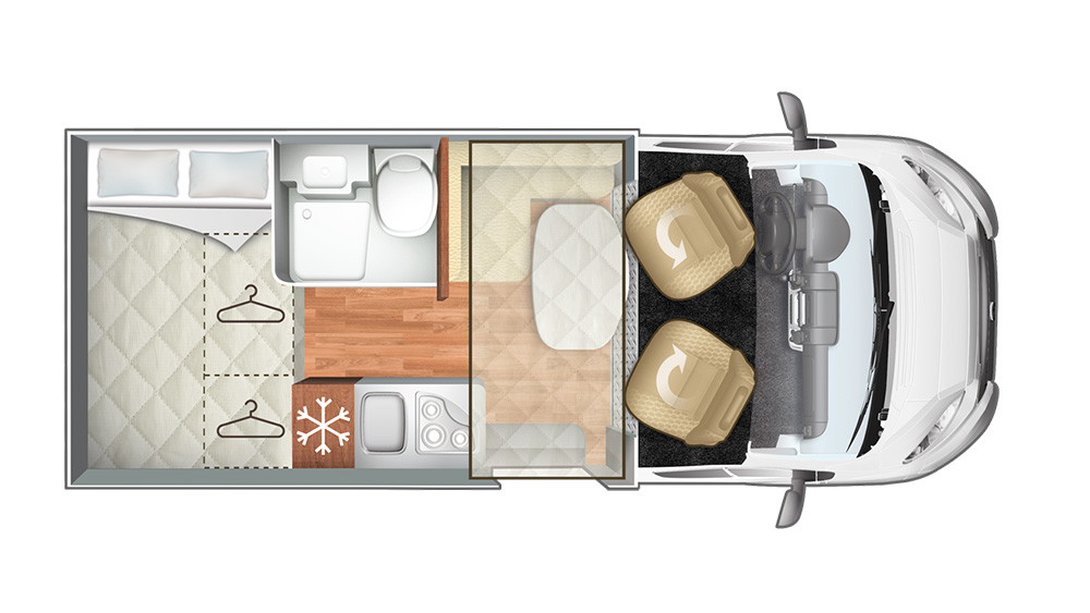 La cucina è ben attrezzata con tre fuochi a gas e un frigorifero trivalente automatico da 135 litri. Il riscaldamento è affidato a un sistema Truma Combi 4 Gas, con spazio per due bombole da 15 kg. Il bagno dispone di un piatto doccia con doppio scarico e un oblò dedicato. L'abitacolo è arricchito da oblò panoramico e centrali per una maggiore luminosità interna.