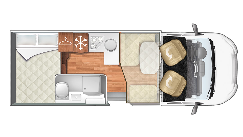 Progettato per ospitare fino a cinque persone, il CI Horon 95 XT dispone di diverse configurazioni di posti letto. Il letto posteriore misura 207x135 cm, mentre il letto supplementare in dinette è di 216x90 cm. Inoltre, è presente un letto basculante di 190x128 cm. Il veicolo è dotato di un ampio gavone con un'apertura utile di 128x100 cm e un'altezza massima interna di 135 cm, ideale per trasportare biciclette o altri grandi oggetti.