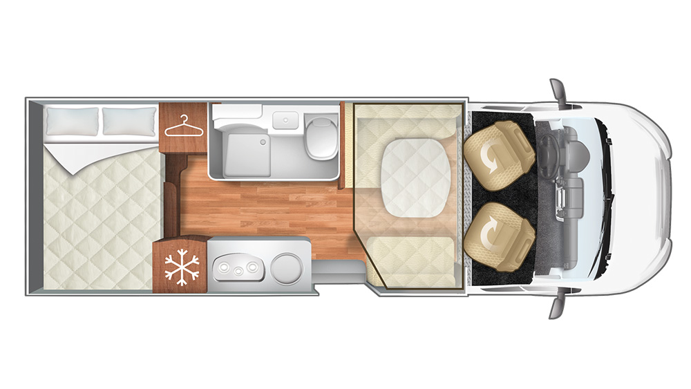 Il camper è dotato di numerosi comfort, come il volante e pomello cambio in pelle, il climatizzatore manuale in cabina, airbag per guidatore e passeggero, cruise control con limitatore di velocità, sedili girevoli e fodere sedili. Il parabrezza termico e i fari fendinebbia sono disponibili con il PACK FORD.