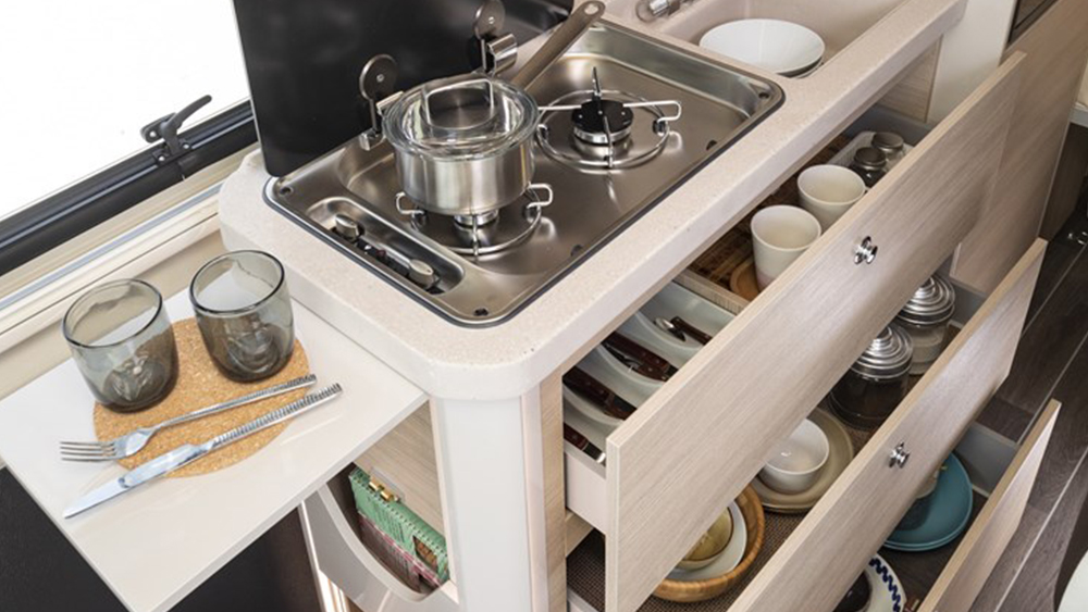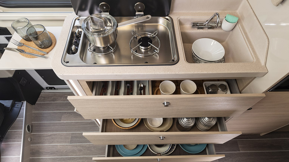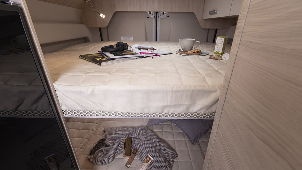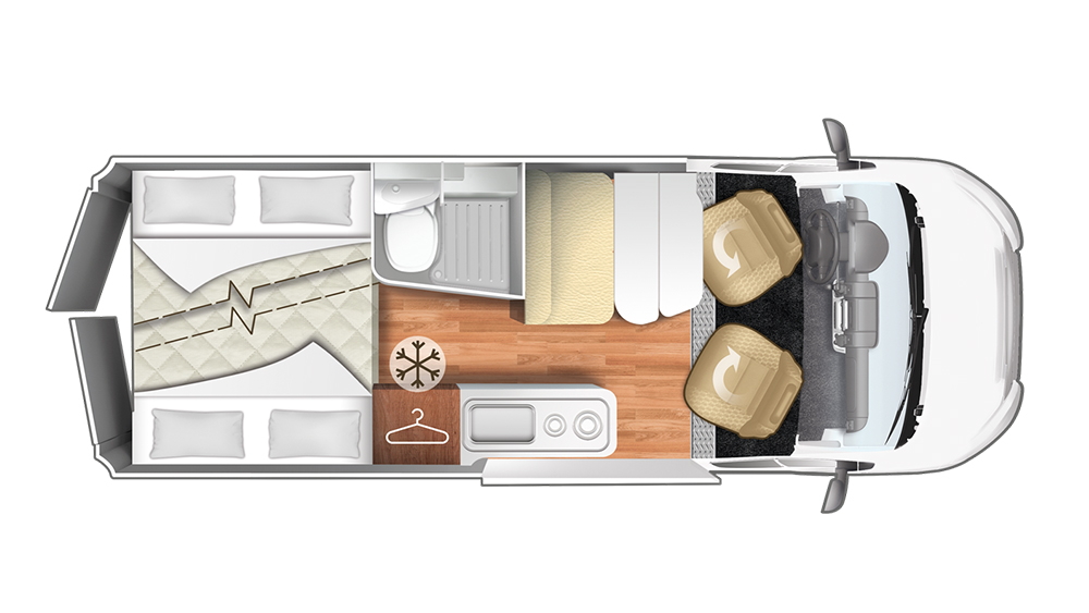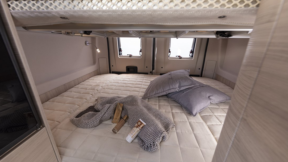 All'interno, lo spazio è sfruttato in modo ottimale, con un'altezza interna di 189 cm che garantisce un ambiente confortevole anche per i viaggiatori più alti. I quattro posti letto, più un letto supplementare opzionale dalla dinette trasformabile, assicurano il massimo comfort durante la notte. Il letto posteriore di dimensioni generose, 186x144 cm, offre un rifugio accogliente dopo una giornata di avventure.