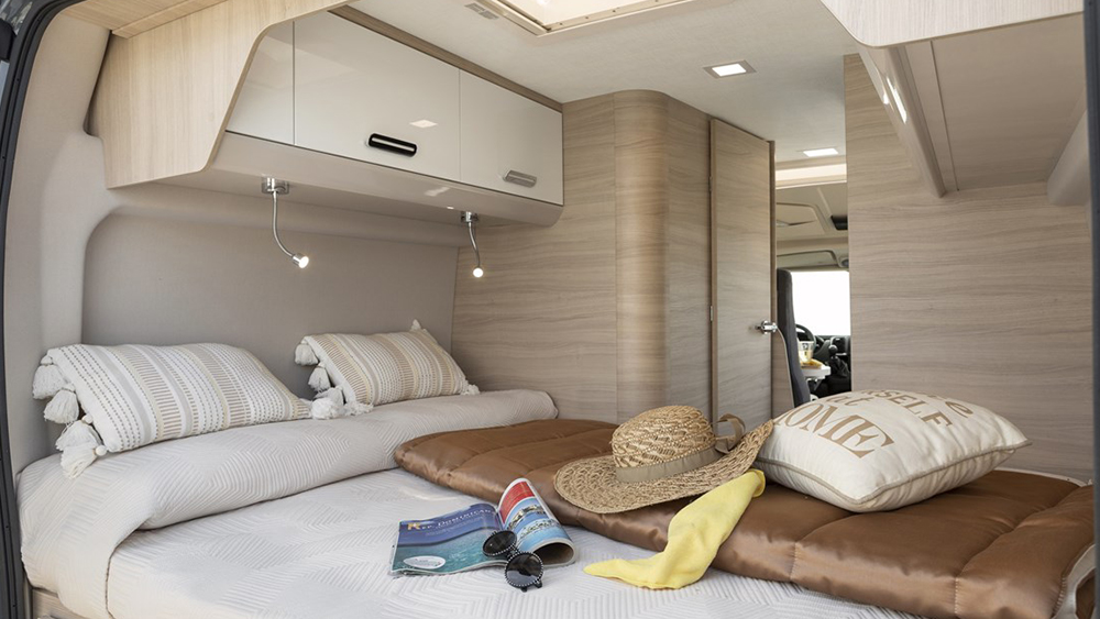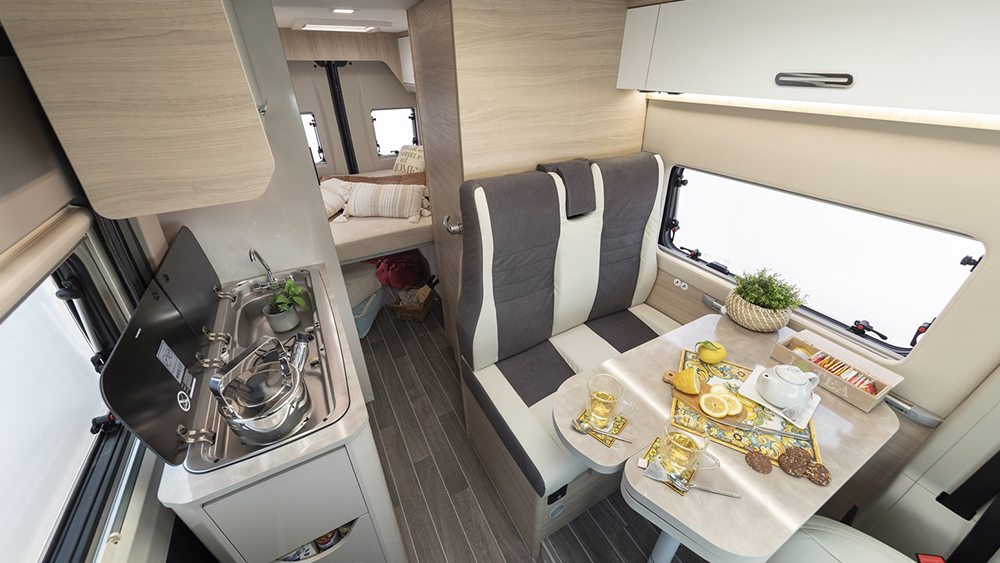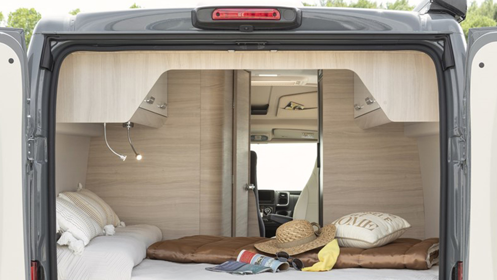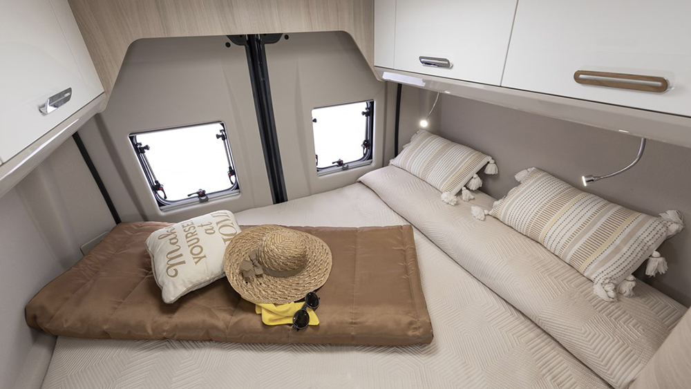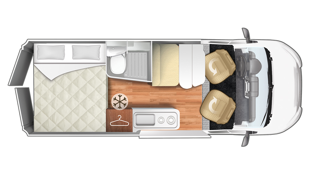 Le sue dimensioni esterne di 5995 mm di lunghezza, 2050 mm di larghezza e 2650 mm di altezza lo rendono spazioso e confortevole. Gli interni accoglienti offrono posti letto per due persone, con un ampio letto posteriore di dimensioni 186x149 cm.