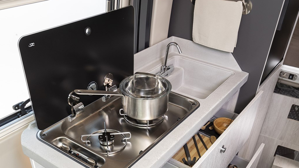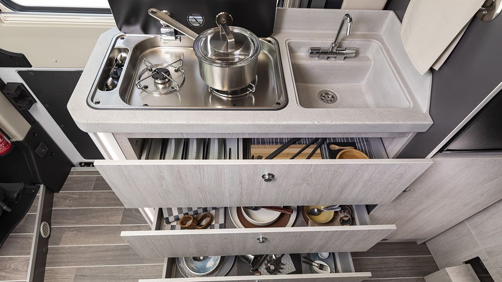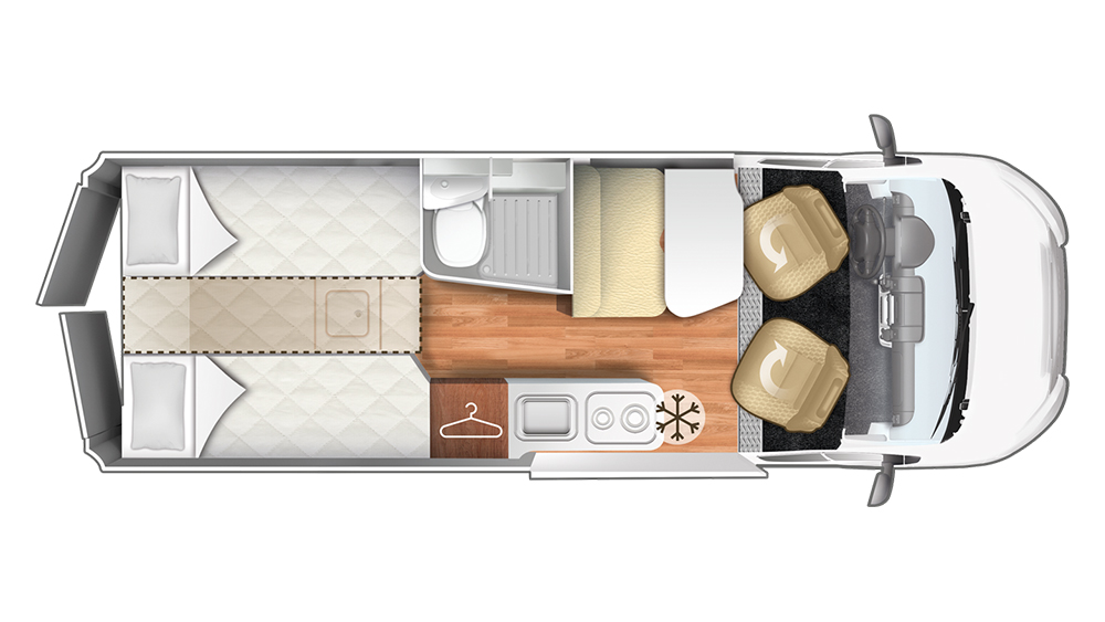 All'interno, il Kyros Duo ospita comodamente fino a 4 persone, con posti letto principali di 195x80 cm e 186x80 cm, oltre a un letto supplementare dalla dinette trasformabile di 156x95 cm. Dotato di oblo' 400x400 mm e un oblo' panoramico 700x500 mm, offre una luminosità naturale e una vista panoramica eccezionale.