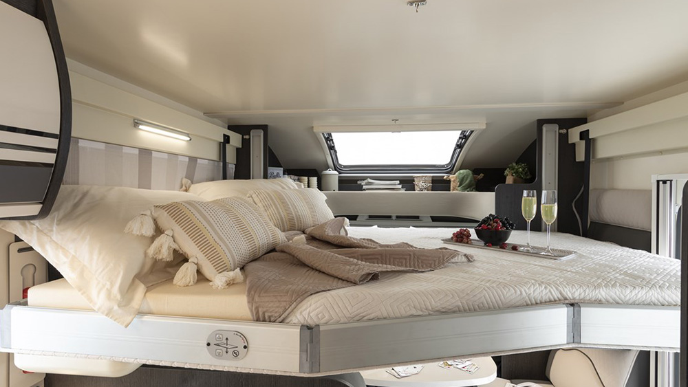 L'abitacolo offre comfort con sedili girevoli e climatizzatore manuale. La sicurezza è garantita dagli airbag per conducente e passeggero, oltre al cruise control con limitatore di velocità. Gli accessori esterni includono un tetto in vetroresina antigrandine, una zanzariera per la porta d'ingresso e una luce esterna a LED.
