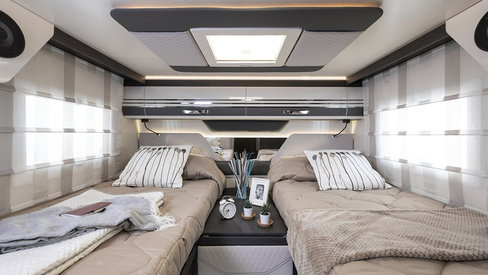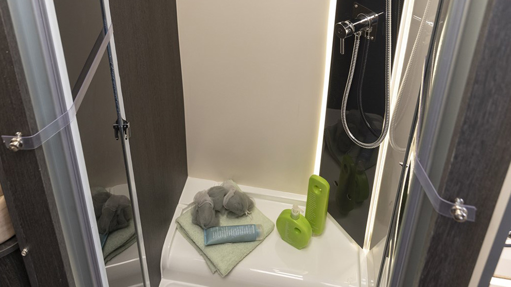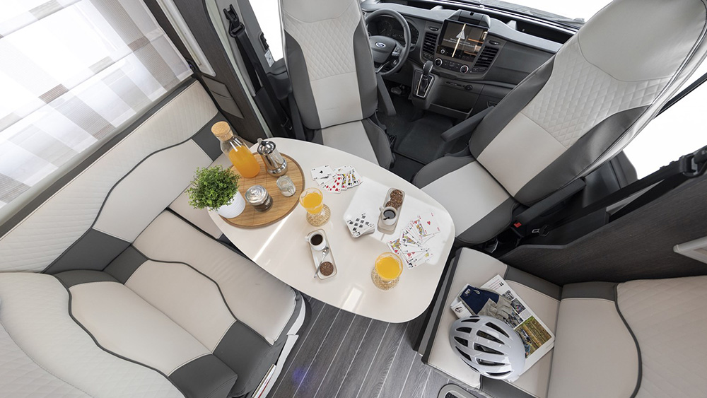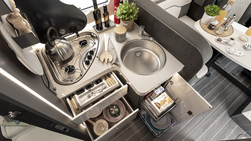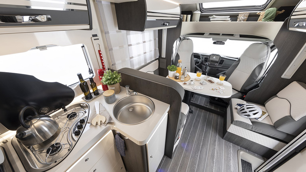 Gli interni sono curati e funzionali, con una cucina dotata di tre fuochi a gas e un frigorifero trivalente da 135 litri. Il riscaldamento è affidato al sistema Truma Combi 4 Gas. I serbatoi per le acque chiare hanno una capacità massima di 100 litri, con una riserva di 20 litri.