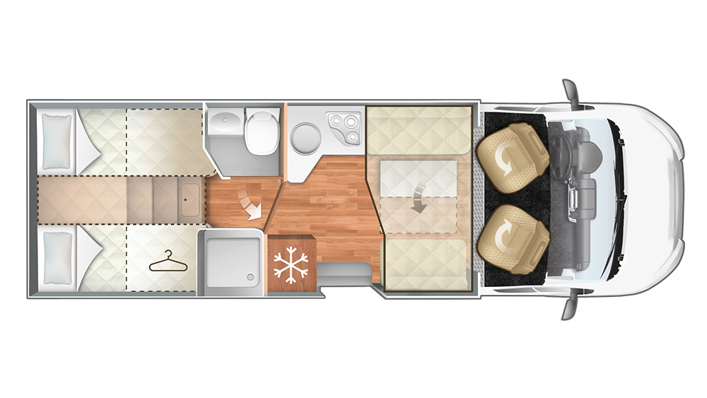 Le sue dimensioni generose offrono spazio sufficiente per una famiglia di quattro persone, con posti letto comodi e versatili. Il letto supplementare dalla dinette trasformabile e il letto posteriore assicurano un sonno riposante, mentre la trasformazione dei letti gemelli in matrimoniale offre flessibilità nell'organizzazione degli spazi.