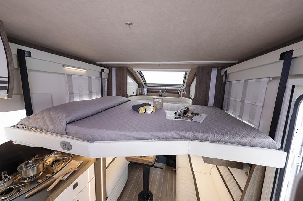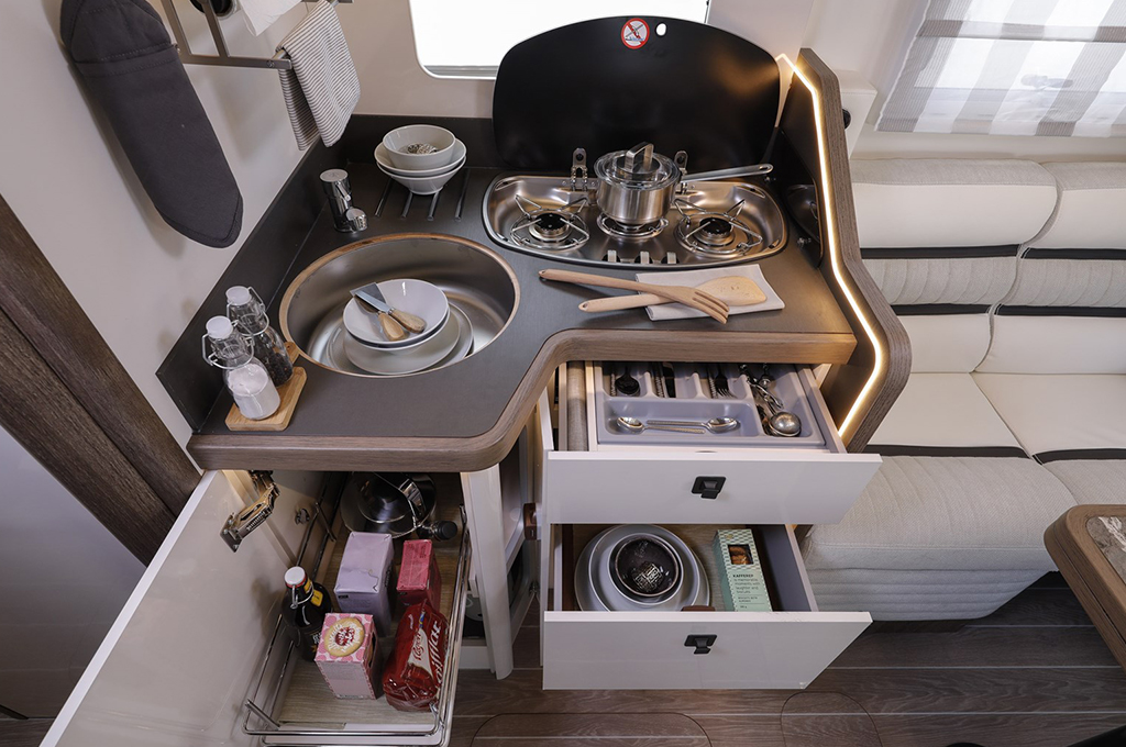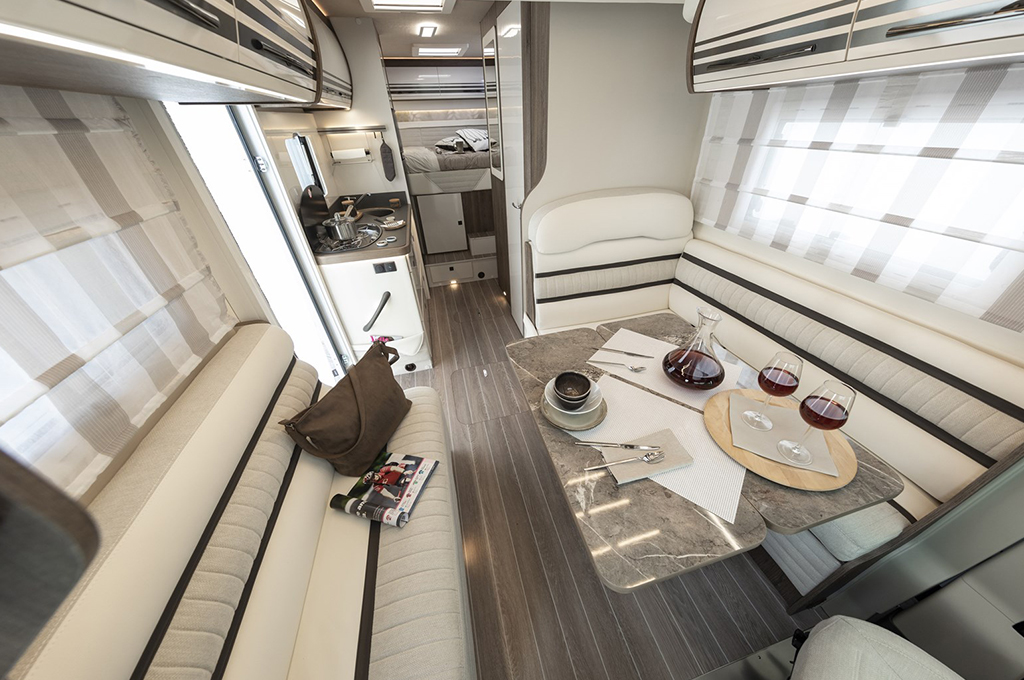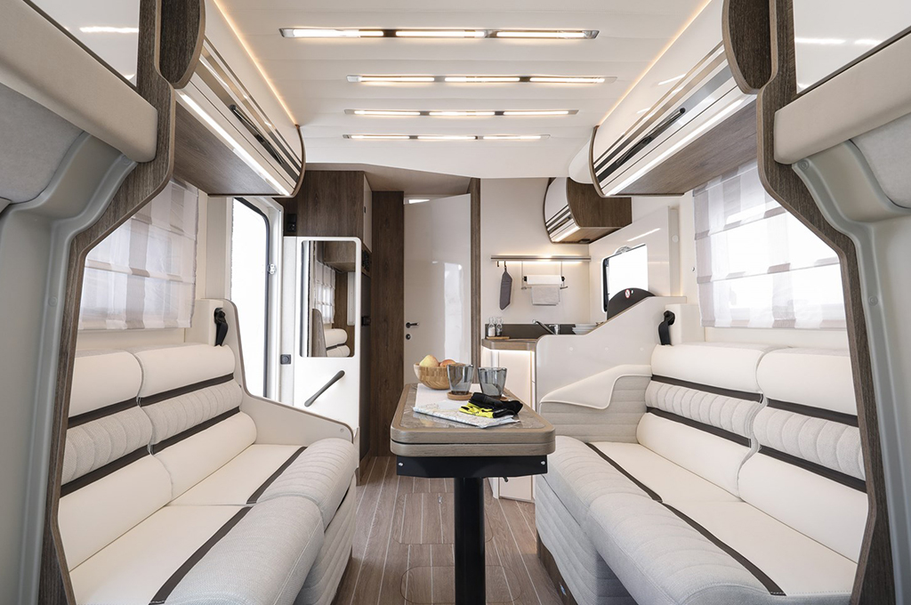 All'interno, l'attenzione ai dettagli e la versatilità degli spazi sono evidenti. Gli ambienti raffinati e trasformabili offrono la flessibilità necessaria per adattare la configurazione interna alle proprie esigenze, con soluzioni come il tavolo a libro ampliabile o il tavolo ruotabile a 360°. La separazione tra zona giorno e notte, insieme alla toilette e alla doccia separate, garantisce privacy e comfort.