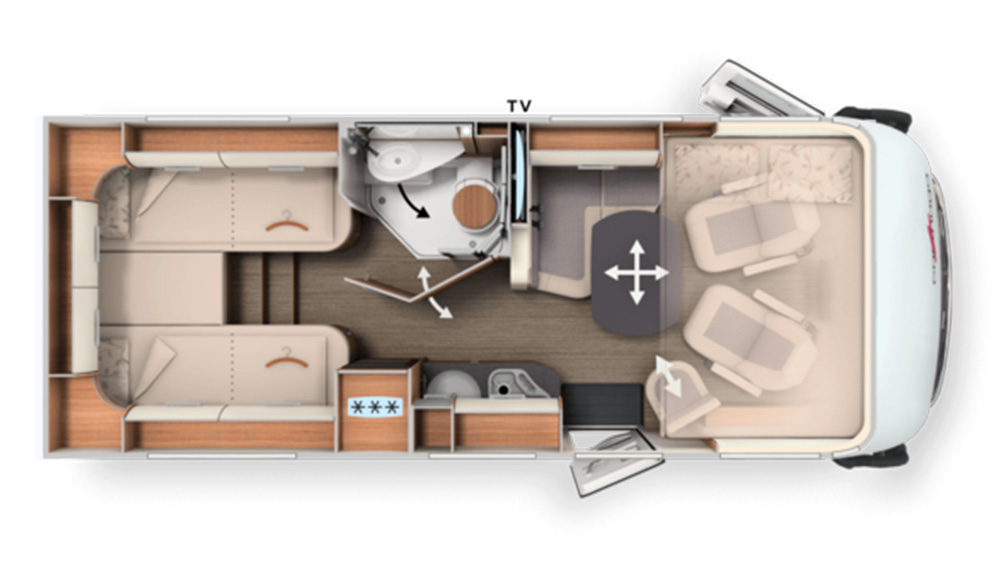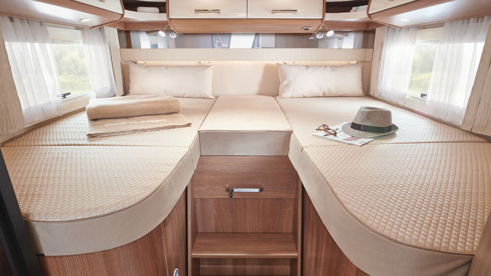 Per facilitare l'accesso ai letti, è presente un gradino estraibile; in opzione, è disponibile un gradino estraibile comfort extra basso, dotato di spazio di stivaggio aggiuntivo. Sotto i letti singoli longitudinali, gli armadi guardaroba offrono un'altezza interna extra grande, grazie alla zona ribassata nel doppio pavimento.