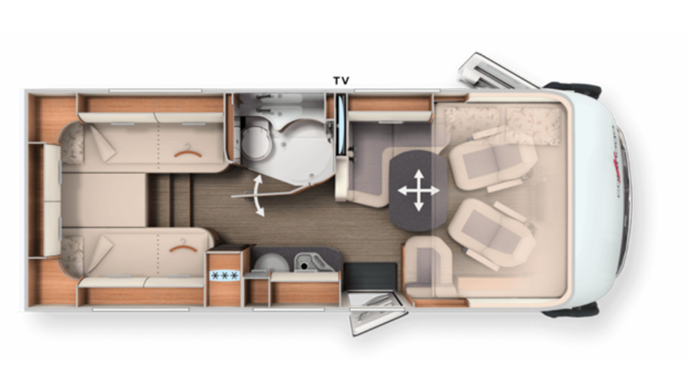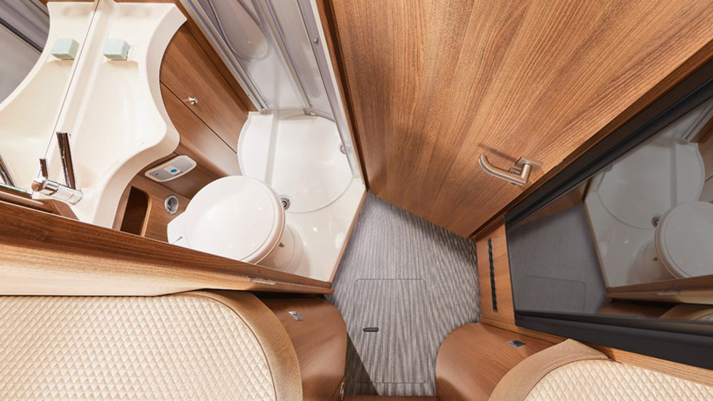 Sotto i letti singoli longitudinali, il camper dispone di armadi guardaroba con un'altezza interna extra grande, sfruttando la zona ribassata nel doppio pavimento. Per un accesso facilitato ai letti, è presente un gradino estraibile, con l'opzione di un gradino estraibile comfort extra basso che offre anche spazio di stivaggio aggiuntivo. Un'opzione interessante è l'armadio TV nella zona notte, dotato di un sistema di estrazione TV speciale.