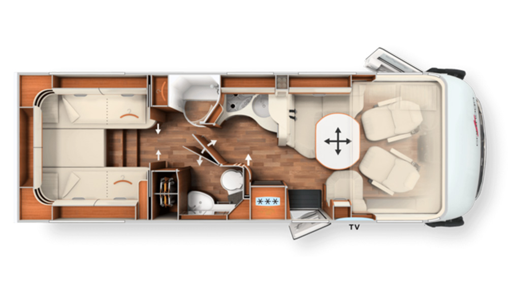 Il bagno spazioso offre una doccia separata per un comfort ottimale, mentre la zona spogliatoio separabile tramite la porta del bagno offre una flessibilità d'uso eccezionale. I grandi letti singoli longitudinali sono dotati di gradino estraibile comfort, con armadi guardaroba integrati per massimizzare lo spazio di stoccaggio.
