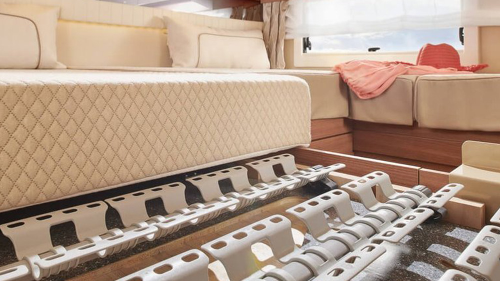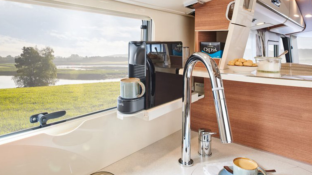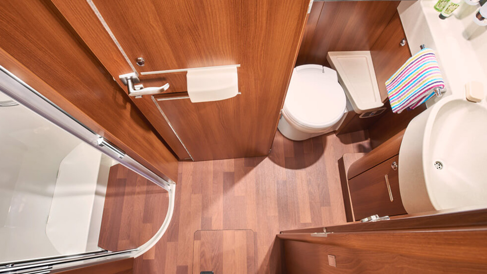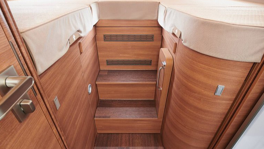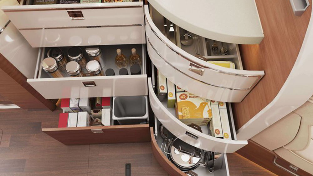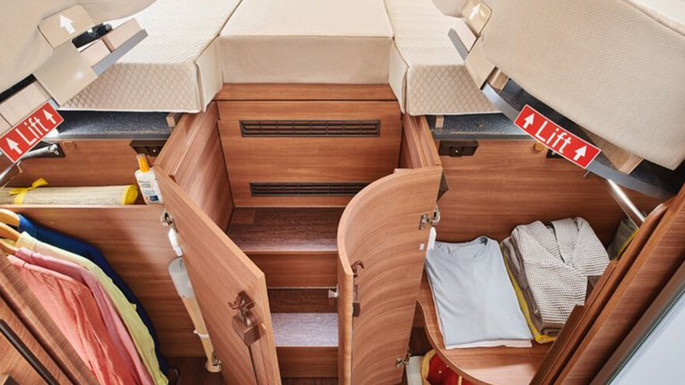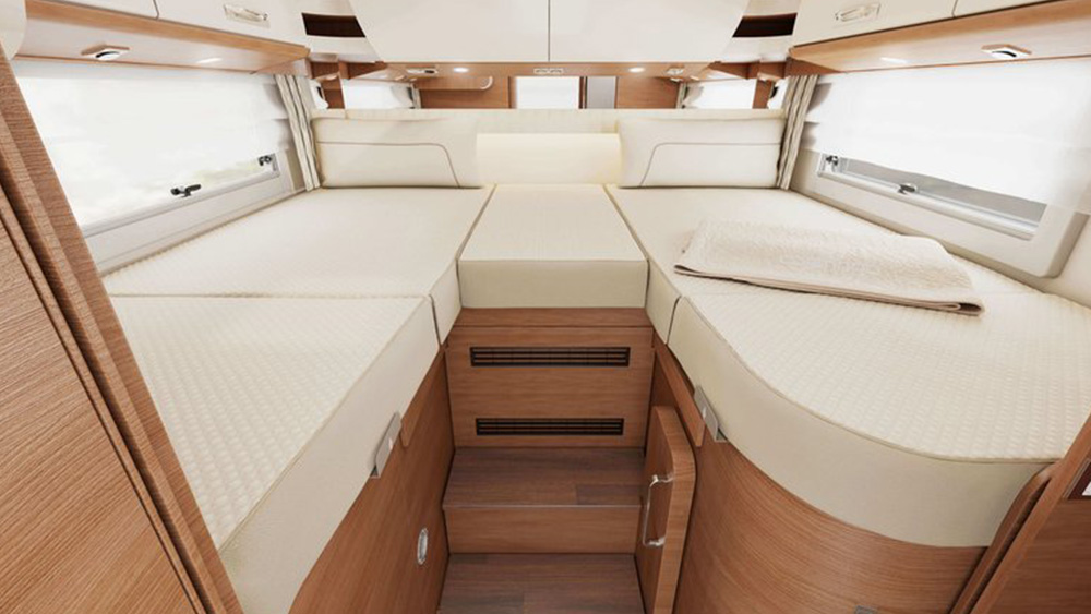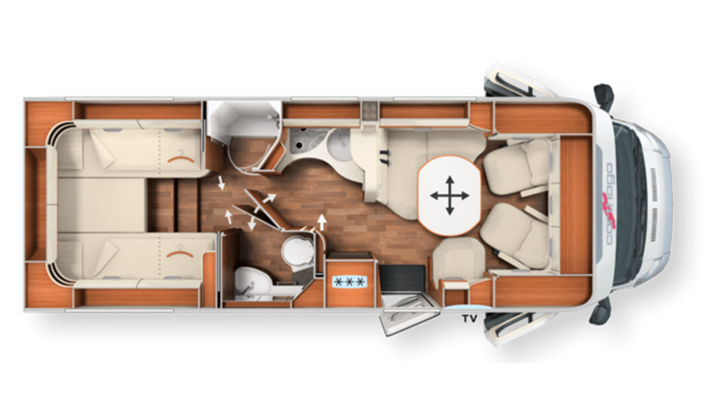 La zona cucina è un vero gioiello di design e funzionalità, con un piano di lavoro arcuato e un mobile bar che non solo separa gli spazi, ma offre anche un ulteriore piano di lavoro. Il bagno, spazioso e confortevole, è dotato di una doccia separata e di un cassetto verticale per massimizzare lo spazio disponibile. La zona notte accoglie due grandi letti singoli longitudinali, con armadi guardaroba al di sotto per un'organizzazione ottimale degli effetti personali.