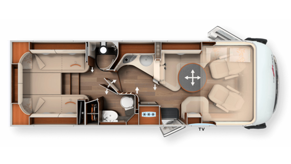 L'architettura del mobilio "emotionale" è un tratto distintivo, che conferisce al camper un'estetica esclusiva e accattivante. Lo spazio two-level, con un'impressionante altezza interna di 211 cm nel soggiorno, crea un ambiente aperto e arioso, invitando gli ospiti a godere del massimo comfort. Il gruppo sedute circolare con tavolo "Luxus" e ampia panca laterale nel soggiorno accolgono gli occupanti con un invito irresistibile a rilassarsi e socializzare.