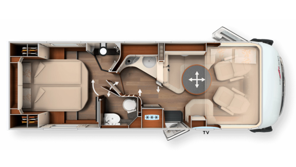 Nel bagno, un cassetto verticale nella parete circolare ottimizza lo spazio per il deposito degli oggetti personali. La zona spogliatoio, separabile tramite una porta spaziosa, offre un'organizzazione efficiente grazie alla doppia porta della zona bagno e alla parete TV estraibile che funge da divisorio. Il letto queen-size extra grande, con una larghezza confortevole fino alla zona dei piedi, promette sonni riposanti durante i viaggi.