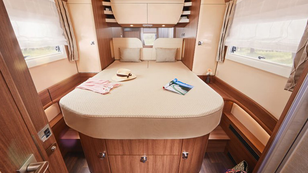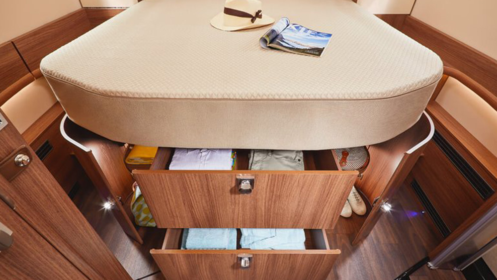 La zona spogliatoio è separabile tramite la porta del bagno spazioso, che svolge una triplice funzione grazie alla doppia porta della zona bagno e alla parete TV estraibile che funge da divisorio. Il letto queen-size extra grande da 200 cm offre un comfort straordinario, con una larghezza confortevole fino alla zona dei piedi, completato da due armadi guardaroba sistemati lateralmente e due grandi cassetti sulla parte frontale del letto.