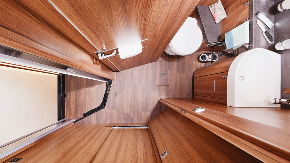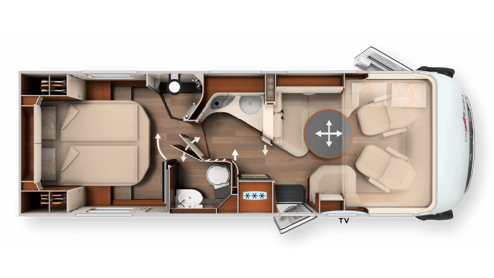 La cucina angolare offre un comfort ottimale, con un piano di lavoro arcuato che permette di preparare i pasti con facilità e praticità. Un cassetto verticale nella parete circolare del bagno aggiunge ulteriore spazio di archiviazione, ottimizzando l'organizzazione degli oggetti personali.